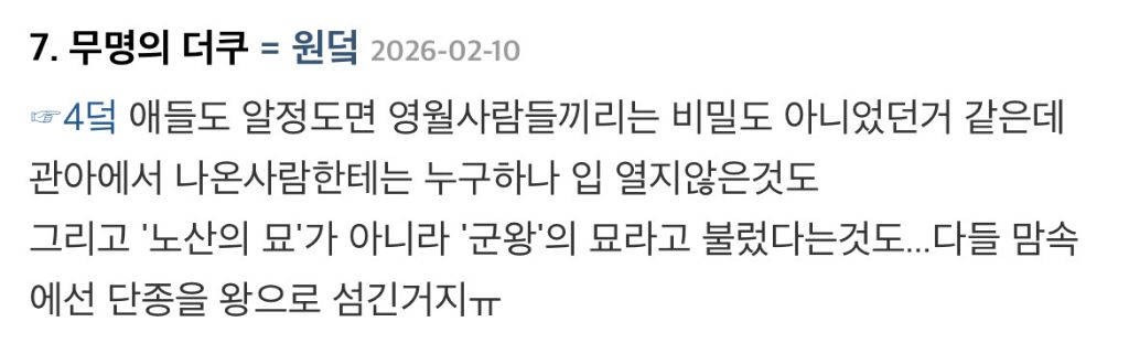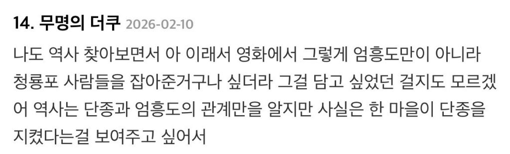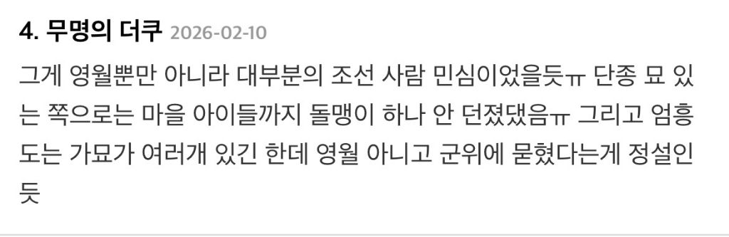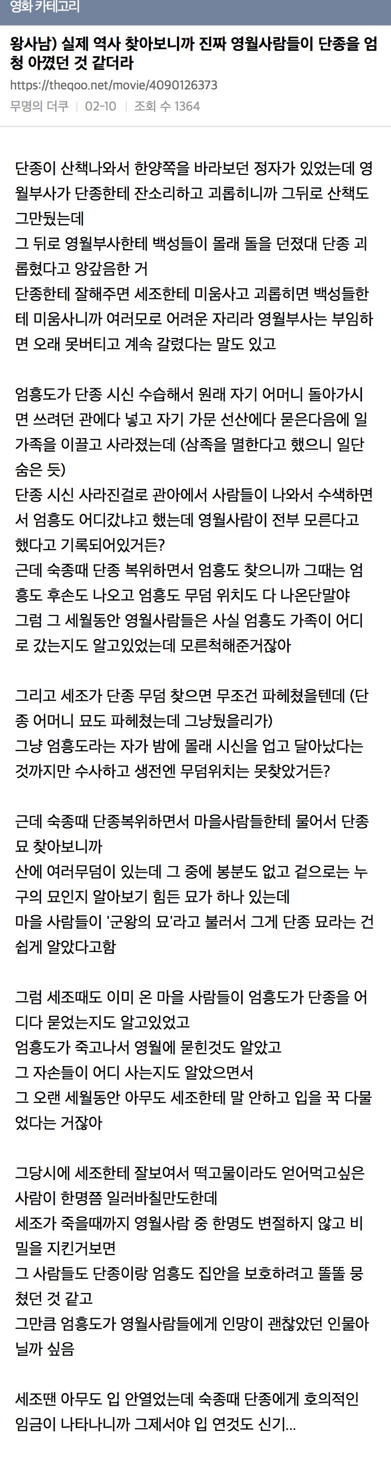 [스크랩] [흥미돋]왕과 사는 남자)영월 사람들이 단종을 엄청 아꼈구나 작성자아흐레|작성시간26.02.14|조회수17,637 목록 댓글 52 글자크기 작게가 글자크기 크게가 https://youtu.be/N66__4utiXo?si=brmJFgeNyOgaKnm8단종이 왕위에서 쫒겨난 나이 불과 14살 다음검색 스크랩 원문 : 도탁스 (DOTAX) 현재 게시글 추가 기능 열기 북마크 공유하기 신고 센터로 신고 댓글 댓글 52 댓글쓰기 답글쓰기 댓글 리스트 작성자대전 건들지말라고 | 작성시간 26.02.15 시발 수양 이새끼 진짜 지옥 가서 천벌 받암ㅅ길 작성자나는솔로사랑은계속된다 | 작성시간 26.02.15 넘 슬프다.. 작성자에그롤 | 작성시간 26.02.15 ㅠㅠㅠ눈물난다 작성자늑ab 롯데레아 케찹도둑 | 작성시간 26.02.15 과몰입 레전드ㅡㅠㅠㅜ엉엉 작성자모모@ | 작성시간 26.02.16 나 또 울어 ㅠㅠㅠㅠ시발 눈물나ㅠㅠㅠㅠ 댓글 전체보기