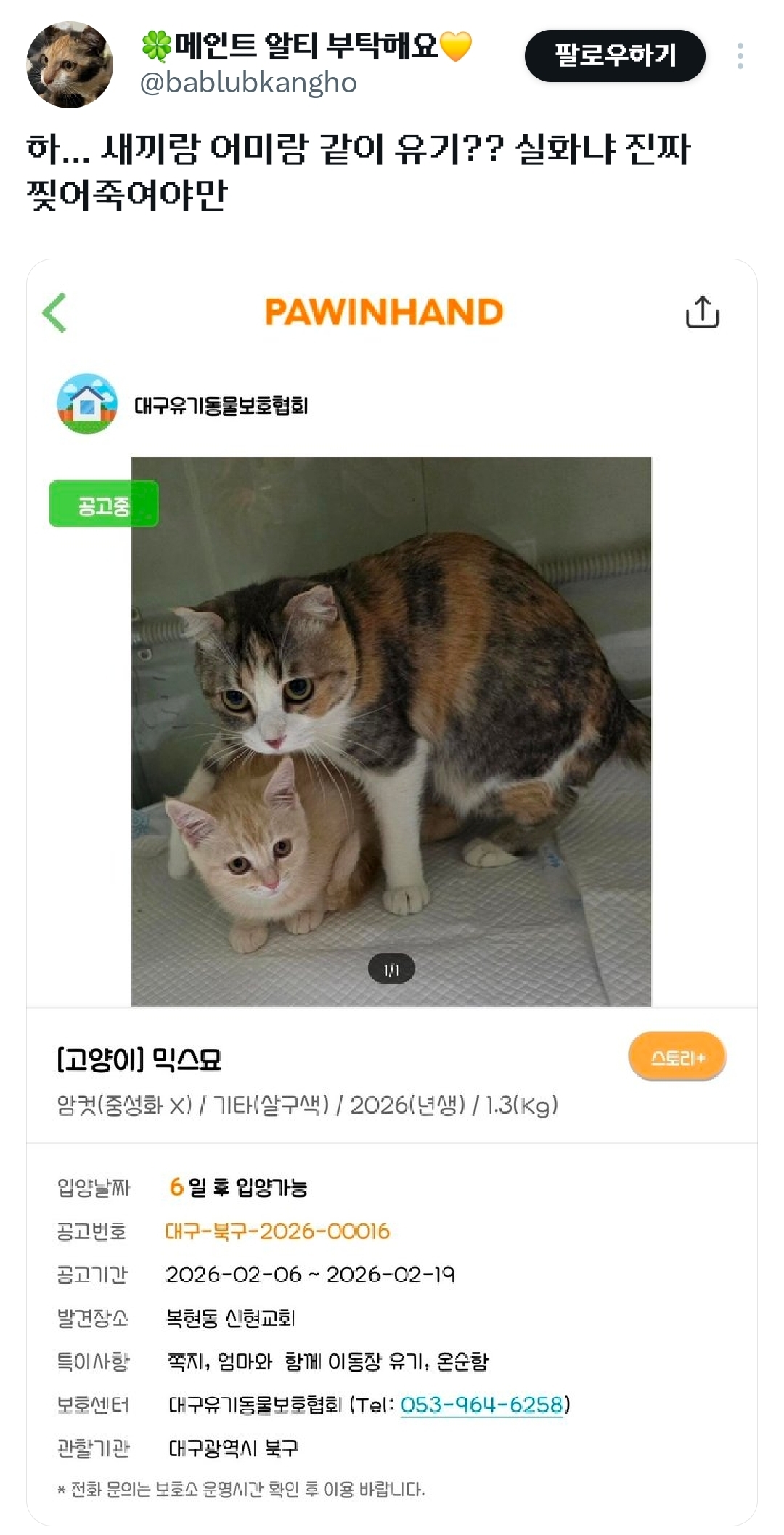 [기타]새끼와 함께 이동장에 유기당한 고양이 작성자누룩곰팡이|작성시간26.02.14|조회수10,763 목록 댓글 37 글자크기 작게가 글자크기 크게가 출처: https://x.com/i/status/2022363939376611662X의 🍀메인트 알티 부탁해요💛님(@bablubkangho)하... 새끼랑 어미랑 같이 유기?? 실화냐 진짜 찢어죽여야만x.com엄마도 애기같은데 그와중에 새끼 지키는거봐...😢 다음검색 현재 게시글 추가 기능 열기 북마크 공유하기 신고 센터로 신고 댓글 댓글 37 댓글쓰기 답글쓰기 댓글 리스트 작성자백합미역국 | 작성시간 26.02.14 ㅠㅠㅠㅠㅠㅠ 작성자지금은 맞고 그때는 틀니다 | 작성시간 26.02.14 아이고야....ㅠㅠ 작성자강쥐고양사랑행 | 작성시간 26.02.14 버린새끼 죽었으면 좋겠다 작성자점박이물범 | 작성시간 26.02.14 좋은 가족들 만났으면ㅠㅠ 작성자허뉘머쓱타드 | 작성시간 26.02.14 아 존나 빡치네 저렇게 애기들을... 하... 댓글 전체보기