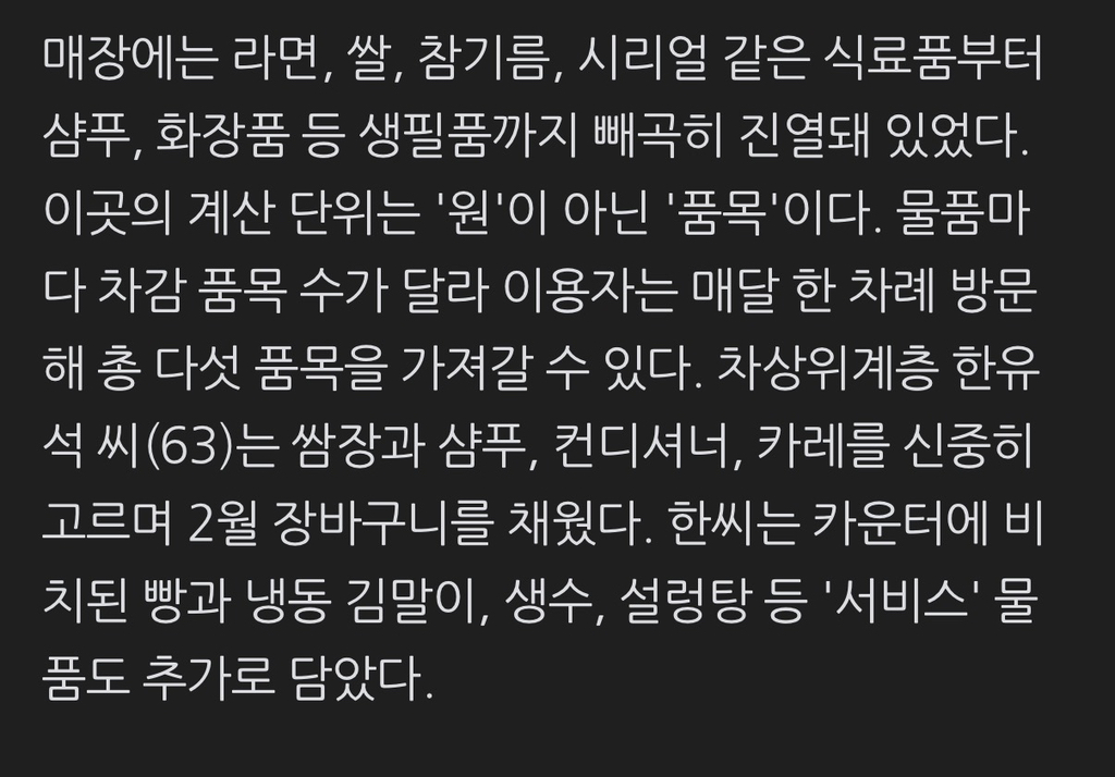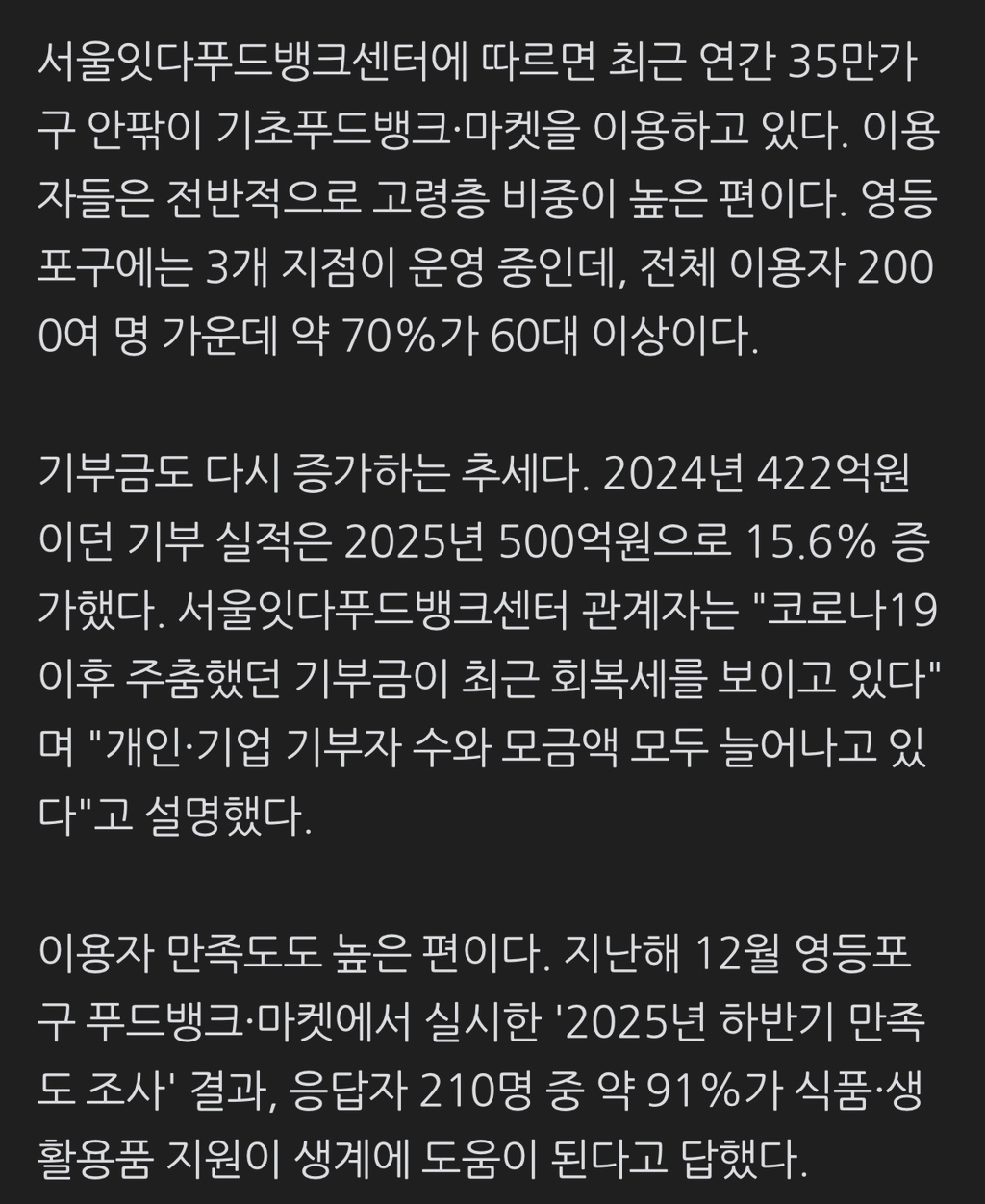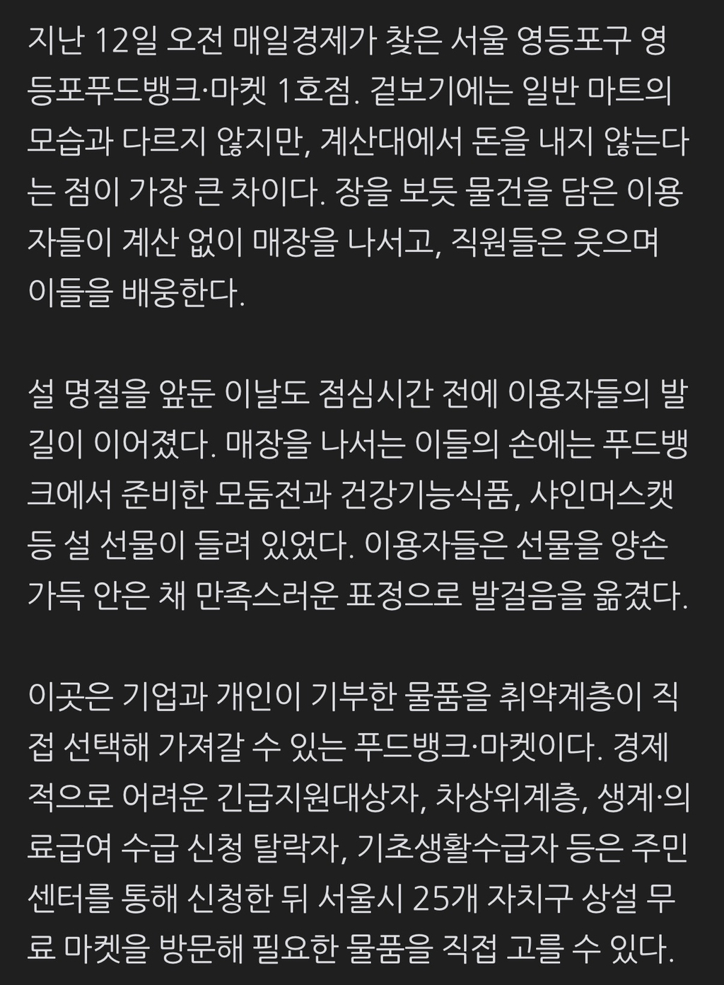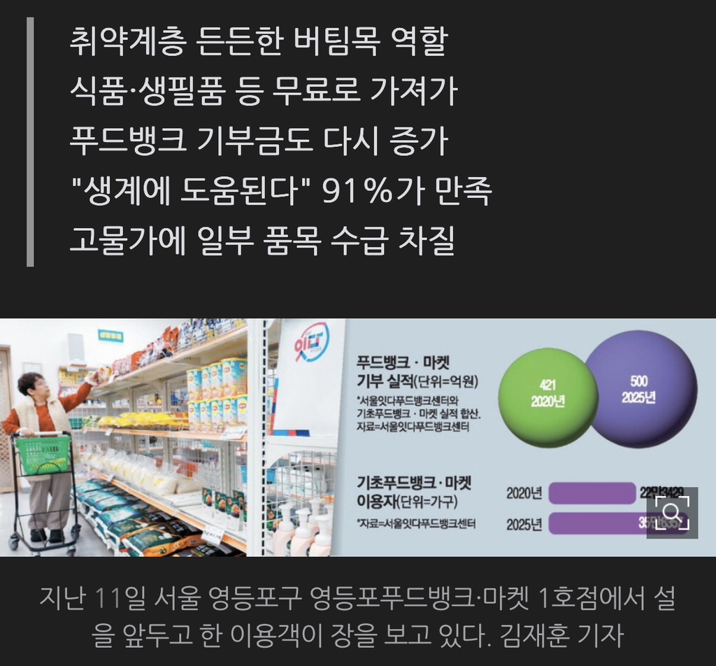 [여시뉴스데스크]"부침가루·당면 … 푸드뱅크 덕에 설 납니다" 작성자튀겨|작성시간26.02.14|조회수5,101 목록 댓글 4 글자크기 작게가 글자크기 크게가 출처: https://n.news.naver.com/article/009/0005637381?sid=102"부침가루·당면 … 푸드뱅크 덕에 설 납니다"취약계층 든든한 버팀목 역할 식품·생필품 등 무료로 가져가 푸드뱅크 기부금도 다시 증가 "생계에 도움된다" 91%가 만족 고물가에 일부 품목 수급 차질 "대형마트에 가면 5만원이나 써야 하는 n.news.naver.com전문출처 다음검색 현재 게시글 추가 기능 열기 북마크 공유하기 신고 센터로 신고 댓글 댓글 4 댓글쓰기 답글쓰기 댓글 리스트 작성자머니머니깁미머니 | 작성시간 26.02.14 진짜 좋은 정책이군 작성자레몬라임앤비터스 | 작성시간 26.02.14 되게 괜찮다 뭐 고를지 고민도 하게되고 작성자자메이카닭다리 | 작성시간 26.02.14 좋다좋다 ㅠ 고를 수도 있고 작성자뭘해도 2찍보다 1찍 이재명지지 | 작성시간 26.02.14 이재명 아바디 진짜 좋은정책 ㅠㅠ굶는게 서럽다고ㅜㅜ 댓글 전체보기