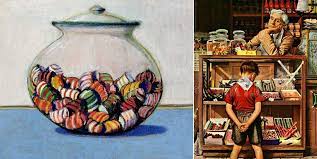 이 쪽엔 박하 향기가 나는 납작한 박하사탕이 있었다. 그리고 쟁반엔 뺨이 불룩해지는 굵직굵직한 눈깔사탕이 있었다. 단단하고 반들반들하게 짙은 암갈색 설탕 옷을 입힌 땅콩을 위그든 씨는 조그마한 주걱으로 떠서 팔았는데, 두 주걱에 1센트 였다. 물론 감초 과자도 있었다. 그것을 베어 문 채로 입안에서 녹여 먹으면, 꽤 오래 우물거리며 먹을 수 있었다.