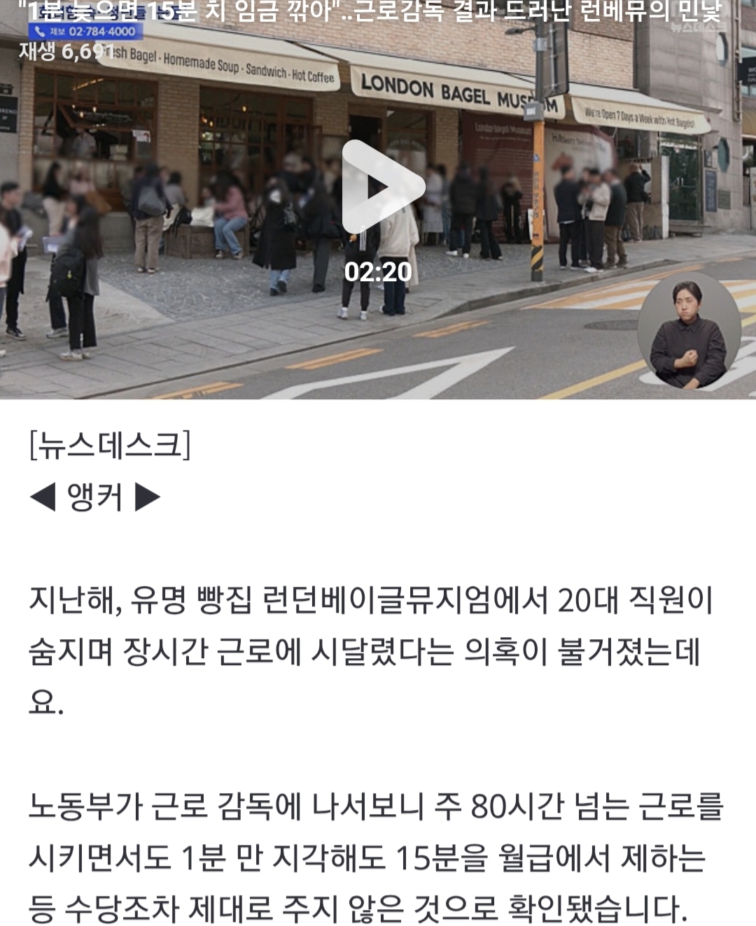 [여시뉴스데스크]"1분 늦으면 15분 치 임금 깎아"‥근로감독 결과 드러난 런베뮤의 민낯 작성자qosuxh|작성시간26.02.14|조회수4,695 목록 댓글 8 글자크기 작게가 글자크기 크게가 출처: https://n.news.naver.com/article/214/0001480799?sid=102"1분 늦으면 15분 치 임금 깎아"‥근로감독 결과 드러난 런베뮤의 민낯◀ 앵커 ▶ 지난해, 유명 빵집 런던베이글뮤지엄에서 20대 직원이 숨지며 장시간 근로에 시달렸다는 의혹이 불거졌는데요. 노동부가 근로 감독에 나서보니 주 80시간 넘는 근로를 시키면서도 1분n.news.naver.com 다음검색 현재 게시글 추가 기능 열기 북마크 공유하기 신고 센터로 신고 댓글 댓글 8 댓글쓰기 답글쓰기 댓글 리스트 작성자스택앤스모크 | 작성시간 26.02.14 진짜 개표독스럽다 작성자나다요요요 | 작성시간 26.02.14 우와.. 진짜 어마무시하네 작성자초당감자 | 작성시간 26.02.14 그런데 학생때 알바하면 다 이런식이였는데 악습은 그대로 유지되나봄ㅋㅋㅋ 작성자하버드부속고등학교 | 작성시간 26.02.14 직원들한테 그렇게 해서 번 돈으로 잘먹고 잘살았구나 작성자200억 | 작성시간 26.02.14 옛날이랜드같은걸,,,, 댓글 전체보기