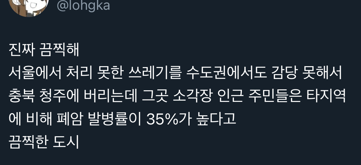 [스크랩] [기타]15년간 주민 105명이 폐암에 걸린 마을 작성자Melogold|작성시간26.02.14|조회수11,012 목록 댓글 15 글자크기 작게가 글자크기 크게가 출처: https://naver.me/5W9QSyOShttps://www.ggilbo.com/news/articleView.html?idxno=817605@lohgka+ (5년전기사)니들 쓰레기 니들이 처리해.. 다음검색 스크랩 원문 : *여성시대* 차분한 20대들의 알흠다운 공간 현재 게시글 추가 기능 열기 북마크 공유하기 신고 센터로 신고 댓글 댓글 15 댓글쓰기 답글쓰기 댓글 리스트 작성자여신스멜녀 | 작성시간 26.02.15 서울 쓰레기는 서울에서 처리해!!!!!!!!! 작성자아몬드브리즈맛있다 | 작성시간 26.02.15 심각하다 진짜;;; 작성자정신똑바로차리고싶다 | 작성시간 26.02.15 어이없어 작성자진달래꽃빵 | 작성시간 26.02.15 서울 집값 오르는 이유가 있었네 작성자꾸꾸까까? | 작성시간 26.02.15 서울 쓰레기 서울이 처리해라 댓글 전체보기