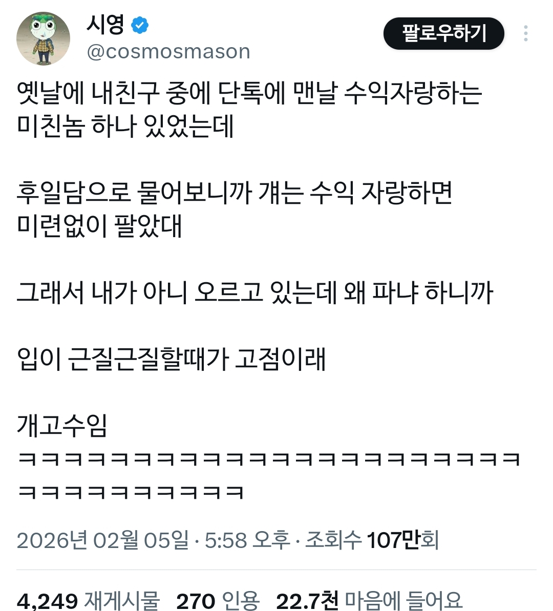 [흥미돋]주식 언제 팔아야할지 알려줌 작성자나무기차|작성시간26.02.15|조회수16,913 목록 댓글 44 글자크기 작게가 글자크기 크게가 출처: https://x.com/i/status/2019334922650153249X의 시영님(@cosmosmason)옛날에 내친구 중에 단톡에 맨날 수익자랑하는 미친놈 하나 있었는데 후일담으로 물어보니까 걔는 수익 자랑하면 미련없이 팔았대 그래서 내가 아니 오르고 있는데 왜 파냐 하니까 입이 근질근x.com여기서 더 오를 거 같지만미련없이 매도할 수 있는 것도 능력 다음검색 현재 게시글 추가 기능 열기 북마크 공유하기 신고 센터로 신고 댓글 댓글 44 댓글쓰기 답글쓰기 댓글 리스트 작성자걱정금지 | 작성시간 26.02.15 근데 맞는말임. 캡쳐순간이 딱 내 그릇인거야. 팔고나서는 미련없다 작성자지쳣나요례 | 작성시간 26.02.15 그랬는데 국장이 나만 놓고 가버렸어요 슬퍼 작성자새싹 | 작성시간 26.02.15 근데 팔까말까하고 안팔았는데 하락하더니 다시 전고점찍음... 작성자도리도리팽도리 | 작성시간 26.02.16 현차 잘팔았어 ㅎㅎㅎㅎ 작성자1122334455 | 작성시간 26.02.16 ㄹㅇ 캡처하고 안팔았더니 그게 고점이었음 ㅋㅋ 댓글 전체보기
