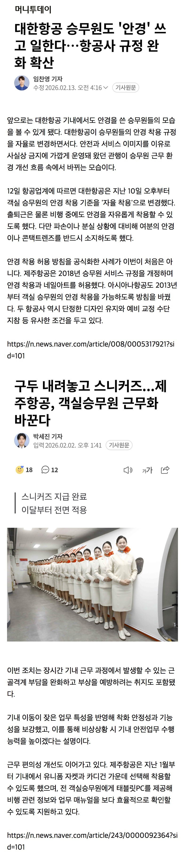 [흥미돋]승무원 근무환경 개선을 위해 안경,스니커즈 허용중인 항공사들 작성자Sunmoonstar02|작성시간26.02.15|조회수22,087 목록 댓글 26 글자크기 작게가 글자크기 크게가 출처: https://theqoo.net/square/4095983307 다음검색 현재 게시글 추가 기능 열기 북마크 공유하기 신고 센터로 신고 댓글 댓글 26 댓글쓰기 답글쓰기 댓글 리스트 작성자헤이댓츠미 | 작성시간 26.02.15 안경 드디어 작성자디즈니월드잉글리시 | 작성시간 26.02.15 아니 여지껏 안됐던거야? 그게 충격이다 작성자야 내가 집에 너만한 애비가 있어 | 작성시간 26.02.16 안경이 왜안돼? 헐 작성자oreo oz | 작성시간 26.02.16 신발 진짜 기괴함 긴급상황 생각하면 당연히 편한신발 신도록 해야지 작성자didosn | 작성시간 26.02.16 좋다좋다 댓글 전체보기