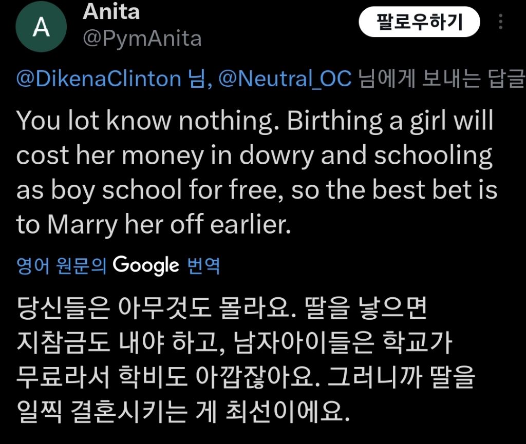 [눈물한방울]엄마가 자신이 딸이라 싫어한다는것을 아는듯한 신생아 작성자노예와 12똥냥|작성시간26.02.15|조회수103,684 목록 댓글 35 글자크기 작게가 글자크기 크게가 출처: https://x.com/i/status/2022724831205077377X의 Dera II님(@Neutral_OC)This woman is going viral after she gave birth to a baby girl and refused to touch her because she wanted a boy instead. Even the baby felt the negative energy from her mom. 😔x.com인도인거같음신생아가 엄마곁에서 저런 표정 짓는거 처음봐ㅠ 다음검색 현재 게시글 추가 기능 열기 북마크 공유하기 신고 센터로 신고 댓글 댓글 35 댓글쓰기 답글쓰기 댓글 리스트 작성자어쩌고스페셜리스트 | 작성시간 26.02.16 방금 태어난 애기가 눈치를 보는게 저게 맞는거야??? 하… 진짜 너무한다 작성자보코니 | 작성시간 26.02.16 에혀.. 작성자털복숭이 | 작성시간 26.02.16 나라가 미개하다.. 작성자투 헤븐 | 작성시간 26.02.16 저 국가는 끝이 파멸일듯 작성자섹시마루 | 작성시간 26.02.16 ai영상 아냐? 댓글 전체보기