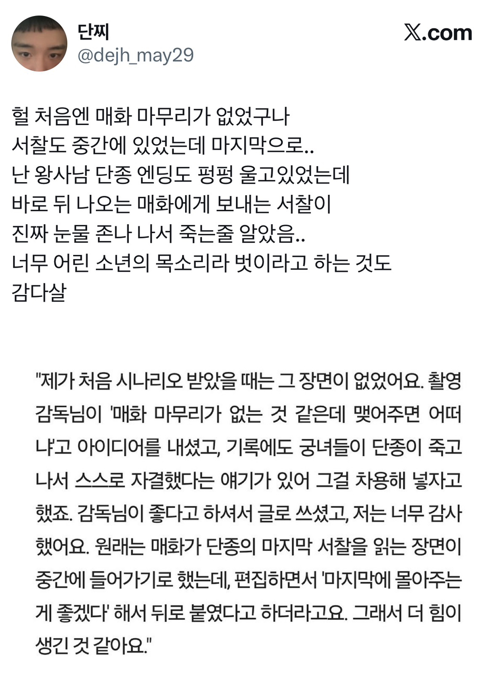 [흥미돋]왕사남의 단종을 오타쿠저격캐로 만든 화룡점정은 난 활쏘기라고 생각해 ㅋㅋ 작성자날씨구림|작성시간26.02.15|조회수61,717 목록 댓글 50 글자크기 작게가 글자크기 크게가 출처: 더쿠 트위터 ••• 다음검색 현재 게시글 추가 기능 열기 북마크 공유하기 신고 센터로 신고 댓글 댓글 50 댓글쓰기 답글쓰기 댓글 리스트 작성자살기귀찮아 | 작성시간 26.02.16 한국에서 밥물을 안줘? 것도 16-17세 애한테,,? 아 진짜 죽고 또죽이고 말라죽이거싶어 작성자로또1등당첨나야나나야나 | 작성시간 26.02.17 아시바 또눈물나 샹 수양십샤끼야 작성자No.10 김연경 | 작성시간 26.02.17 ㅅㅂ 또 울어 수양 개쳐도랏냐 작성자반짝빛을내 | 작성시간 26.02.17 어흐 너무 슬퍼ㅜㅜ 작성자돌아뿌리버럭시아스 | 작성시간 26.02.19 ㅠㅠㅠㅠㅠㅠㅠㅠ 댓글 전체보기
