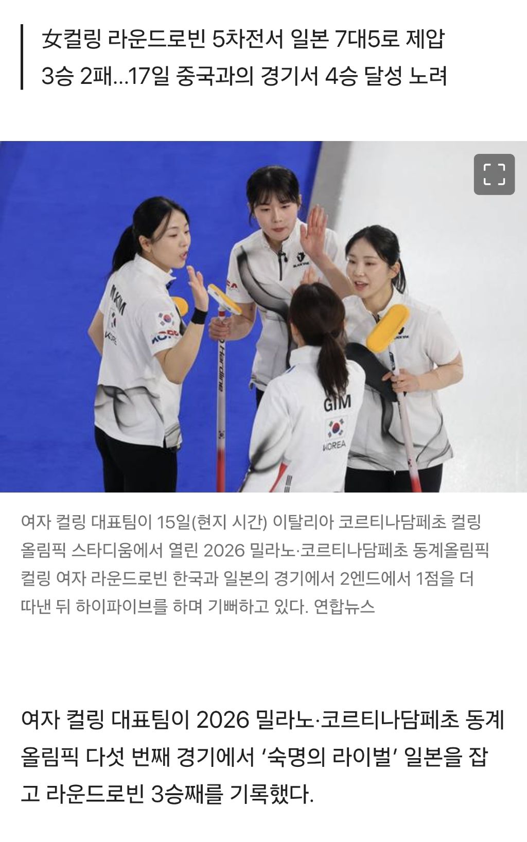 여자 컬링 대표팀이 2026 밀라노·코르티나담페초 동계올림픽 다섯 번째 경기에서 ‘숙명의 라이벌’ 일본을 잡고 라운드로빈 3승째를 기록했다.