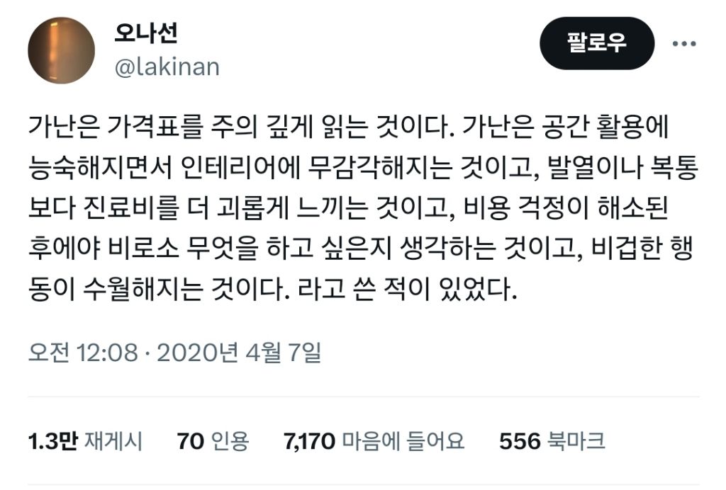 작성자( 본인 닉네임 ) 작성시간 26.02.16 가난은 내 취향과 선호를 무디게 하는 과정이라고 하더라.