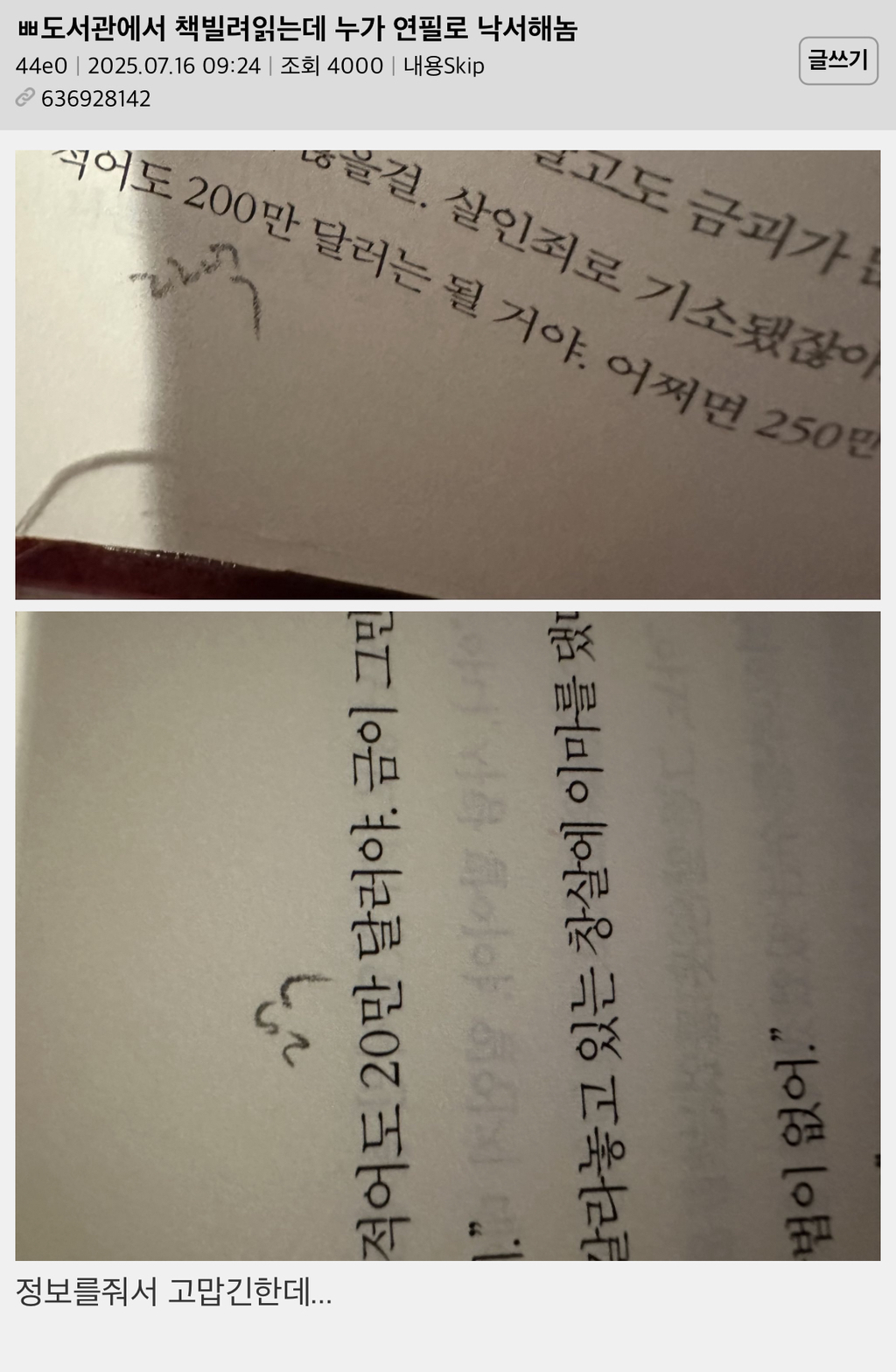 [스크랩] [흥미돋]도서관에서 책빌려읽는데 누가 연필로 낙서해놈 작성자라이도|작성시간26.02.16|조회수47,187 목록 댓글 34 글자크기 작게가 글자크기 크게가 출처: 여성시대 (이용약관이요)https://hygall.com/636928142해연갤 - ㅃ도서관에서 책빌려읽는데 누가 연필로 낙서해놈해연갤, 해외연예갤러리, 영화, 드라마, 배우, 가수, 밴드, 모델, 연예인, 게임, 애니, 스포츠hygall.comㅋㅋㅋㅋㅋㅋㅋㅋㅋ 개웃겨..착한데안착해ㅋㅋㅋㅋㅋㅋㅋㅋㅋㅋㅋㅋ 다음검색 스크랩 원문 : *여성시대* 차분한 20대들의 알흠다운 공간 현재 게시글 추가 기능 열기 북마크 공유하기 신고 센터로 신고 댓글 댓글 34 댓글쓰기 답글쓰기 댓글 리스트 작성자달려라 강쥐 | 작성시간 26.02.16 ㅋㅋㅋㅋㅋㅋㅋㅋㅋㅋㅋㅋㅋㅋㅋㅋㅋㅋ 작성자정떡뚤 | 작성시간 26.02.16 ㅅㅂㅋㅋㅋㅋㅋ 날짜도 적어주라고요 작성자하루야채베리 | 작성시간 26.02.16 ㅋㅋㅋㅋㅋㅋ 감사 작성자아돈기바워 | 작성시간 26.02.16 아 ㅅㅂㅋㅋㅋㅋㅋ ㅜ 작성자범민이 | 작성시간 26.02.21 ㅈㄴ고맙습니다 ... 댓글 전체보기