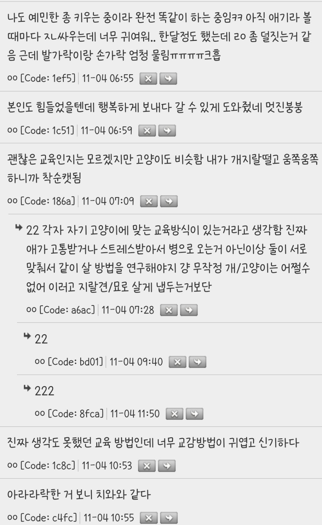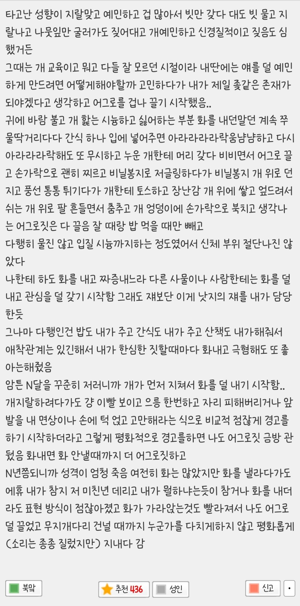 [스크랩] [흥미돋]옛날에 키웠던 강아지가 개예민한 성격이었는데 작성자라이도|작성시간26.02.16|조회수12,702 목록 댓글 4 글자크기 작게가 글자크기 크게가 출처 : https://hygall.com/571248727해연갤 - ㅃ 옛날에 키웠던 댕주작이 개예민한 성격이었는데해연갤, 해외연예갤러리, 영화, 드라마, 배우, 가수, 밴드, 모델, 연예인, 게임, 애니, 스포츠hygall.com 다음검색 스크랩 원문 : *여성시대* 차분한 20대들의 알흠다운 공간 현재 게시글 추가 기능 열기 북마크 공유하기 신고 센터로 신고 댓글 댓글 4 댓글쓰기 답글쓰기 댓글 리스트 작성자니꼬동제련워딩금지 | 작성시간 26.02.16 어? 그래서 울 강쥐들도 순했나… 작성자garuda | 작성시간 26.02.16 저 개지랄..이..나에게는 평소습관인데 그래서 애들이 순한건가 답댓글 작성자garuda | 작성시간 26.02.16 우리집 말티헴 와와헴 다 순하고 착해욧.. 답댓글 작성자스칸디나모스 | 작성시간 26.02.16 나도.. 우리 댕댕한테 매일 하는짓인데 ㅋㅋㅋㅋㅋㅋㅋㅋㅋㅋㅋㅋㅋㅋㅋㅋㅋㅋㅋㅋ 댓글 전체보기