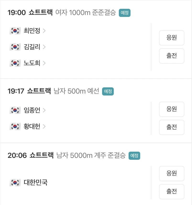[흥미돋]잠시후 시작되는 올림픽 쇼트트랙 경기🇰🇷 작성자마이퓨|작성시간26.02.16|조회수13,299 목록 댓글 9 글자크기 작게가 글자크기 크게가 출처: 여성시대 마이퓨오후 7시 여자 1000m 준준결승 쇼트트랙 경기🇰🇷최민정, 김길리, 노도희 선수 파이팅🇰🇷 다음검색 현재 게시글 추가 기능 열기 북마크 공유하기 신고 센터로 신고 댓글 댓글 9 댓글쓰기 답글쓰기 댓글 리스트 답댓글 작성자마이퓨 작성자 본인 여부 작성자 | 작성시간 26.02.16 찾아보니까 쭉 하나봐!!!! 작성자오리는꽥꽦 | 작성시간 26.02.16 오천미터 ㅋㅋ 피말린다 작성자(주)익항옳 | 작성시간 26.02.16 고마워! 작성자나무심자 | 작성시간 26.02.16 틀엇다 작성자Twilight | 작성시간 26.02.16 김길리 최민정 진출!! 댓글 전체보기