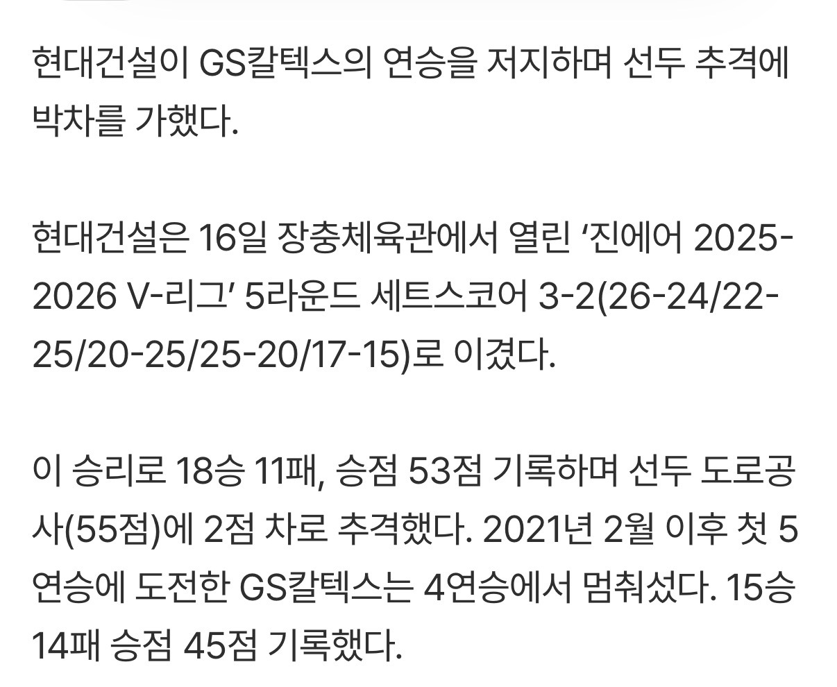 [여시뉴스데스크]현대건설, 풀세트 접전 끝에 GS칼텍스 5연승 저지...선두 2점 차 추격 [MK현장] 작성자슈퍼펭귄시리얼|작성시간26.02.16|조회수1,694 목록 댓글 1 글자크기 작게가 글자크기 크게가 출처: https://m.sports.naver.com/volleyball/article/410/0001112542현대건설, 풀세트 접전 끝에 GS칼텍스 5연승 저지...선두 2점 차 추격 [MK현장]여기를 눌러 링크를 확인하세요m.sports.naver.com 다음검색 현재 게시글 추가 기능 열기 북마크 공유하기 신고 센터로 신고 댓글 댓글 1 댓글쓰기 답글쓰기 댓글 리스트 작성자요가처돌이 | 작성시간 26.02.16 씨핥 직관 갔었는데 개까비 근데 오늘 한복입고 온 애기들 진짜 많아서 귀엽더라 댓글 전체보기