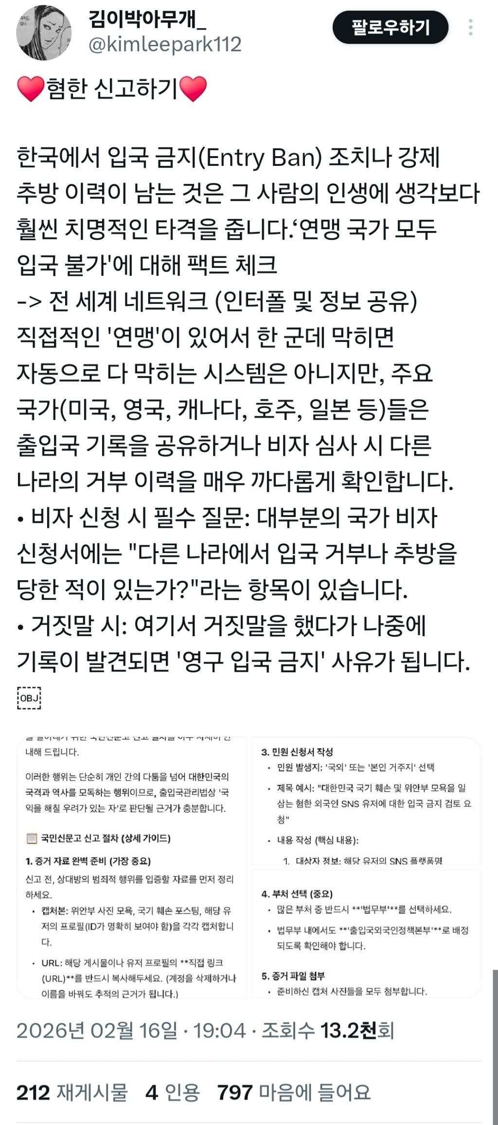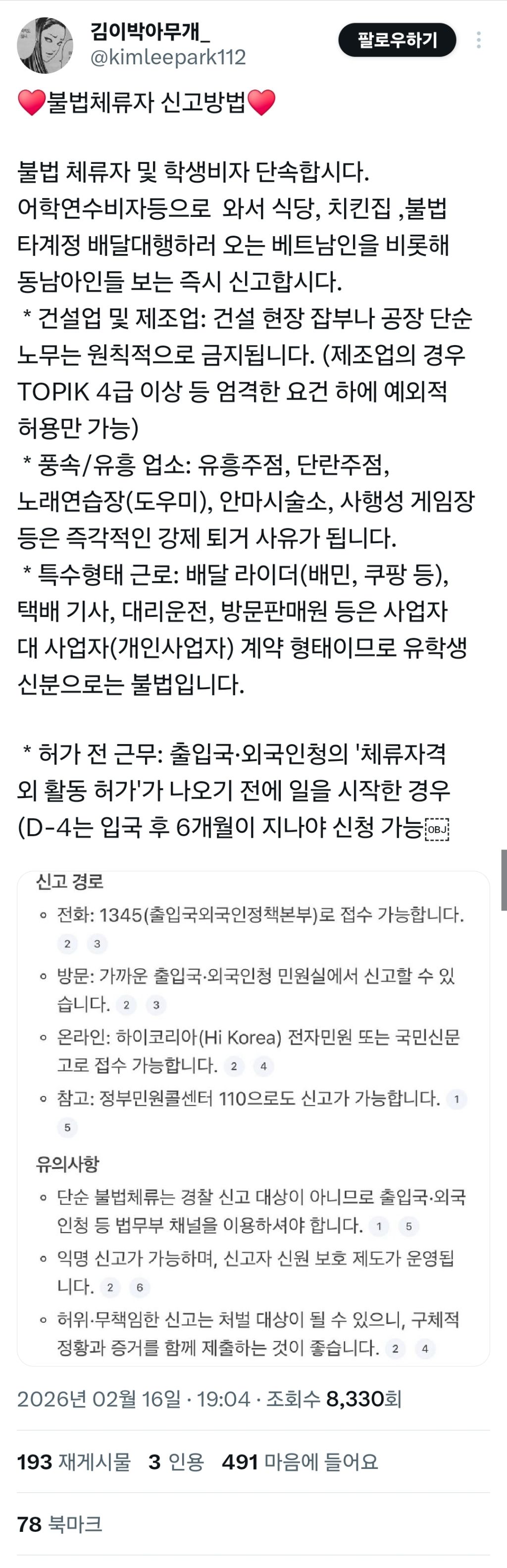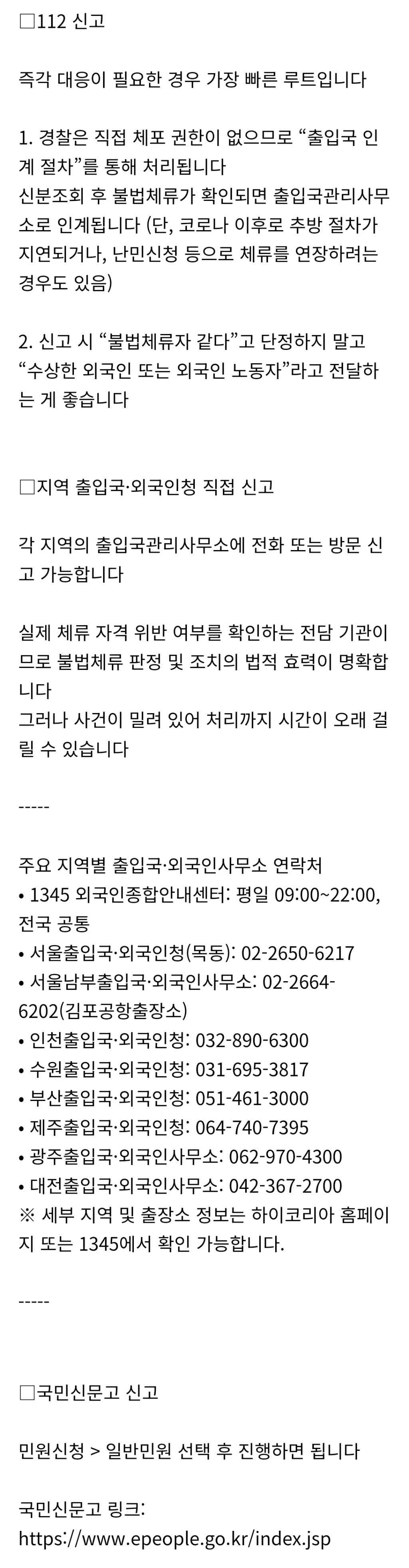 [흥미돋]불법체류자 신고방법 작성자파이링이|작성시간26.02.16|조회수28,666 목록 댓글 68 글자크기 작게가 글자크기 크게가 출처: 여성시대 파이링이https://x.com/i/status/2023337725592789040X의 김이박아무개_님(@kimleepark112)♥️불법체류자 신고방법♥️ 불법 체류자 및 학생비자 단속합시다. 어학연수비자등으로 와서 식당, 치킨집 ,불법 타계정 배달대행하러 오는 베트남인을 비롯해 동남아인들 보는 즉시 신고합x.comhttps://m.blog.naver.com/bookpik/224147612765불법체류자 신고 방법 (+포상금)불법체류자는 사회·안전·노동 시장 등에 영향을 미칠 수 있기 때문에, 법무부에서는 국민 누구나 익명으로 ...blog.naver.com 다음검색 현재 게시글 추가 기능 열기 북마크 공유하기 신고 센터로 신고 댓글 댓글 68 댓글쓰기 답글쓰기 댓글 리스트 작성자입국심사 | 작성시간 26.02.17 불체자들 배달만하고 바로 가는데 어떻게 신고해...? 작성자새콤달콤핑 | 작성시간 26.02.17 싹 다 신고해버려야지 작성자야망뱁새 | 작성시간 26.02.17 우리 동네에 동남아인 요새 엄청 많아졌더라 신고해서 싹다 잡아갔으면 좋겠어 작성자또 이러신다 | 작성시간 26.02.17 싹다 신고해야지 작성자muso | 작성시간 26.02.17 싹 다 신고하자 댓글 전체보기