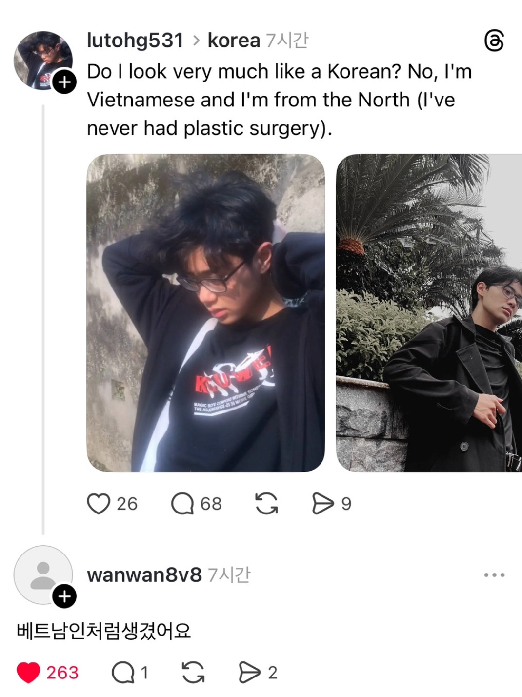 [스크랩] [흥미돋]제가 한국인처럼 생겼나요? 아뇨 전 베트남 사람이고, 성형수술은 단 한번도 받지 않았습니다 작성자flflf|작성시간26.02.17|조회수105,922 목록 댓글 186 글자크기 작게가 글자크기 크게가 다음검색 스크랩 원문 : 이종격투기 현재 게시글 추가 기능 열기 북마크 공유하기 신고 센터로 신고 댓글 댓글 186 댓글쓰기 답글쓰기 댓글 리스트 작성자INNOUTBB | 작성시간 26.02.18 뒷구르기하면서 봐도 동남아사람 작성자땅이울면흙흙 | 작성시간 26.02.18 자아비대 너무 웃곀ㅋㅋ 작성자홍석천의머리끈 | 작성시간 26.02.18 갑자기 뭔데저래? 작성자브리트니점레 | 작성시간 26.02.25 뭐래 누가봐도 벳남 작성자둔둔고양이 | 작성시간 26.02.28 자아가 비대하다 진짜 댓글 전체보기
