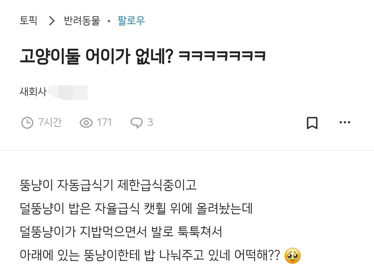 [스크랩] [흥미돋]고양이 두마리 중 한마리가 살 쪄서 급식 제한하면 생기는 일.jpg 작성자누룩곰팡이|작성시간26.02.17|조회수66,278 목록 댓글 26 글자크기 작게가 글자크기 크게가 출처: https://www.dmitory.com/issue/374860600 다음검색 스크랩 원문 : *여성시대* 차분한 20대들의 알흠다운 공간 현재 게시글 추가 기능 열기 북마크 공유하기 신고 센터로 신고 댓글 댓글 26 댓글쓰기 답글쓰기 댓글 리스트 작성자안배고프다 | 작성시간 26.02.17 아ㅋㅋㅋㅋㅋㅋㅋㅋㅋㅋㅋㅋ귀엽다 작성자아카나 와일드프레이리 | 작성시간 26.02.17 헐 너무 똑똑해!!!!!!! 작성자samk | 작성시간 26.02.17 덜뚱냥은 이유가 있다 ㅋㅋㅋㅋㅋㅋㅋ ㄱㅇㅇ 작성자여시횐 | 작성시간 26.02.17 ㅜㅜ얼마나 착한거야 작성자거부기에리 | 작성시간 26.02.17 1004냥이 댓글 전체보기