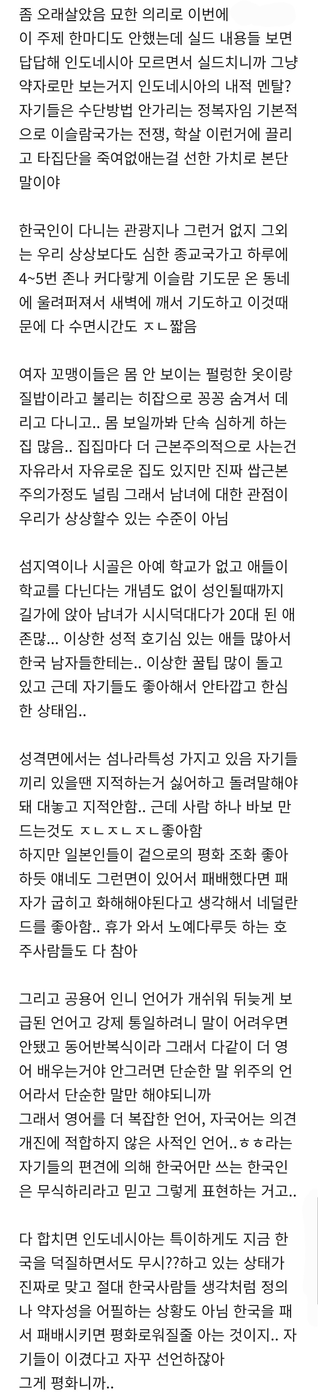 작성자힙스러스터 작성시간 26.02.19 인니 사는 여시인데 죽을맛.. 진짜 오만정 다 털림. 아무리 잘해줘도, 쟤들도 앞에선 웃어도 뒤돌면 배신때려 특히ㅜ이슬람애들