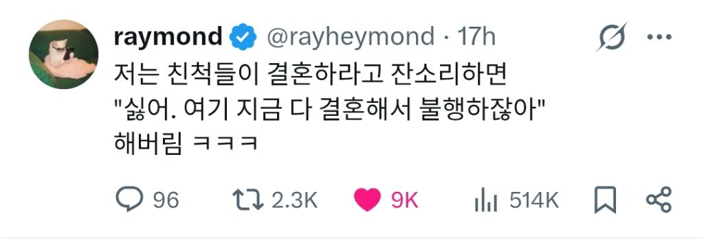 작성자물에사는베짱이 작성시간 26.02.18 결혼무새들은 어떤반격을 해도 타격안받고 결혼하라고함ㅜㅜ