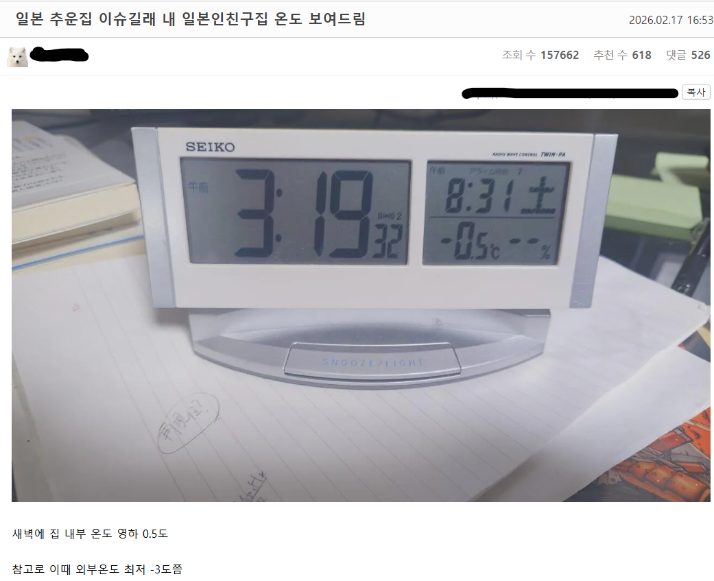 [흥미돋]일본 추운집 이슈길래 내 일본인친구집 온도 보여드림 작성자djkaa|작성시간26.02.17|조회수169,081 목록 댓글 383 글자크기 작게가 글자크기 크게가 출처: https://www.dmitory.com/issue/400566653영하 0.5 ㄷㄷㄷ 다음검색 현재 게시글 추가 기능 열기 북마크 공유하기 신고 센터로 신고 댓글 댓글 383 댓글쓰기 답글쓰기 댓글 리스트 작성자황금골드바 | 작성시간 26.02.23 비닐하우스가 더 따시겠네 작성자Google playboy | 작성시간 26.02.24 ㄹㅇ스티로폼 아이스박스로 집 지어도 저거보단 뜨실 듯;; 작성자뭐시갱이 | 작성시간 26.02.26 잠들면 주거,,,ㄷㄷㄷ,,, 작성자밍키민키키 | 작성시간 26.02.28 길냥이가 더 따뜻하게 잘 듯 작성자싸래기눈 | 작성시간 26.03.01 아니 집인데...... 왜......? 댓글 전체보기