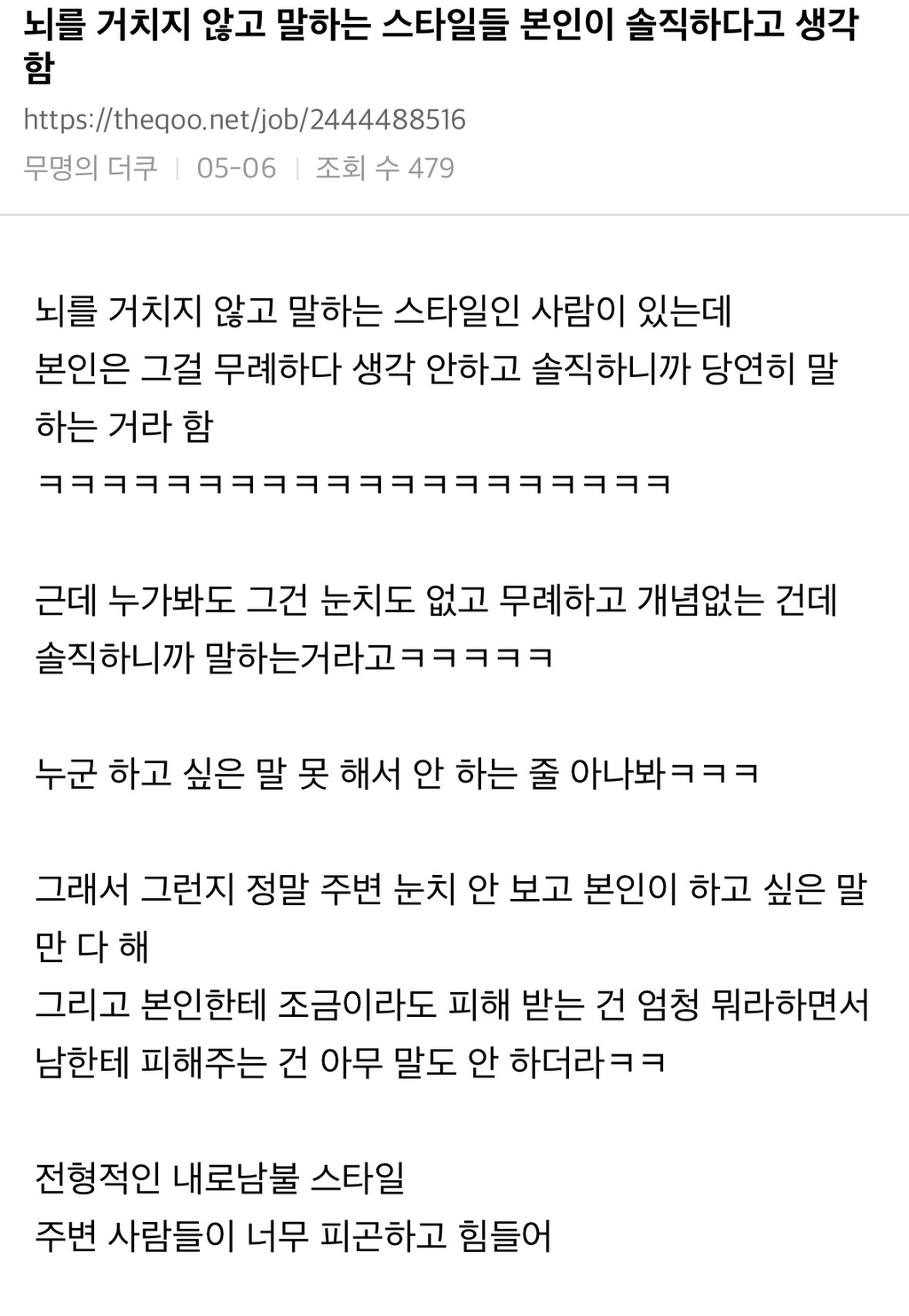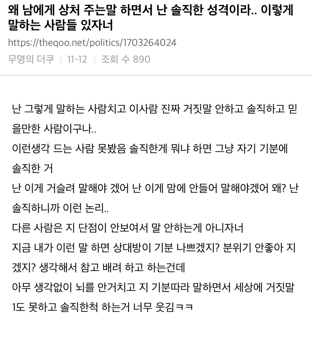 작성자목뿔뼈 작성시간 26.02.17 저런 것들 특징이 사람 봐가면서 솔직함 탈부착한다는 거^^..
