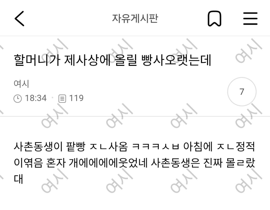 [배꼽의행방]할머니가 제사상에 올릴 빵 사오랬는데 작성자이재는이재명|작성시간26.02.17|조회수58,562 목록 댓글 25 글자크기 작게가 글자크기 크게가 출처: 여성시대 이재는이재명 https://m.cafe.daum.net/subdued20club/Lp0T/176436278모든 이야기의 시작 - Daum 카페모든 이야기의 시작, Daum 카페m.cafe.daum.net불펌 하지마라 다음검색 현재 게시글 추가 기능 열기 북마크 공유하기 신고 센터로 신고 댓글 댓글 25 댓글쓰기 답글쓰기 댓글 리스트 작성자반박시 내말이 다 맞음 | 작성시간 26.02.17 ㅠㅠㅋㅋㅋㅋㅋㅋ 그냥 으른들이 좋아하는거 사왔나봄 작성자바이올렛크럼블 | 작성시간 26.02.17 제사상에 빵도 올리는구나ㅋㅋㅋㅋ 작성자최종합격을 축하드립니다! | 작성시간 26.02.17 아무래도..할머니 소금빵은 안좋아하시니까(?) 작성자겨울러버 | 작성시간 26.02.18 할머니도 웃기실듯 작성자두반장 | 작성시간 26.02.18 주는대로 드셔 그냥 댓글 전체보기