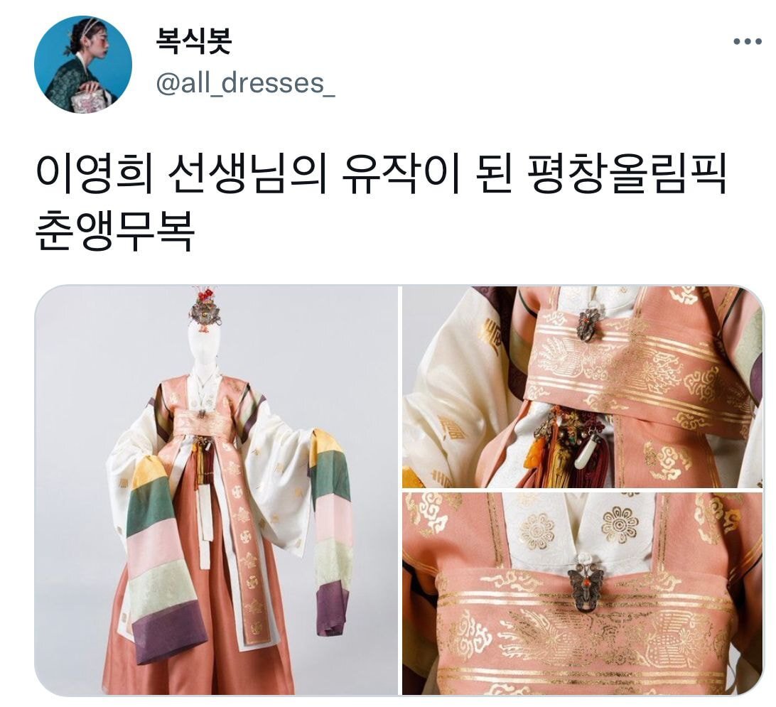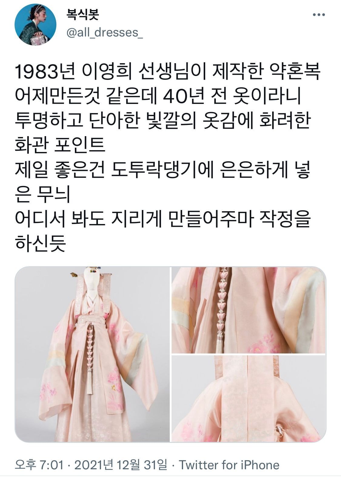 [스크랩] [흥미돋]한복 디자이너 이영희가 40년 전 제작한 약혼복 작성자본인 닉네임.|작성시간26.02.17|조회수42,272 목록 댓글 20 글자크기 작게가 글자크기 크게가 출처 : https://www.dmitory.com/index.php?mid=issue&page=11&document_srl=222961914 다음검색 스크랩 원문 : 엽기 혹은 진실 (세상 모든 즐거움이 모이는 곳) 현재 게시글 추가 기능 열기 북마크 공유하기 신고 센터로 신고 댓글 댓글 20 댓글쓰기 답글쓰기 댓글 리스트 작성자쿠두쫀 | 작성시간 26.02.17 아 진짜 너무 예쁘다 …… 우아하고 색감의 미가 느껴진다고 해야할까 아름다워 작성자행복하다고말하자 | 작성시간 26.02.17 너무 아름다워서 한번 입어보고 싶다.. 작성자존잼잼 | 작성시간 26.02.17 색이 너무 곱다,, 작성자정중한또라이 | 작성시간 26.02.17 선녀같다... 작성자라즈베리봉봉 | 작성시간 26.02.18 와 진짜 예뻐 댓글 전체보기