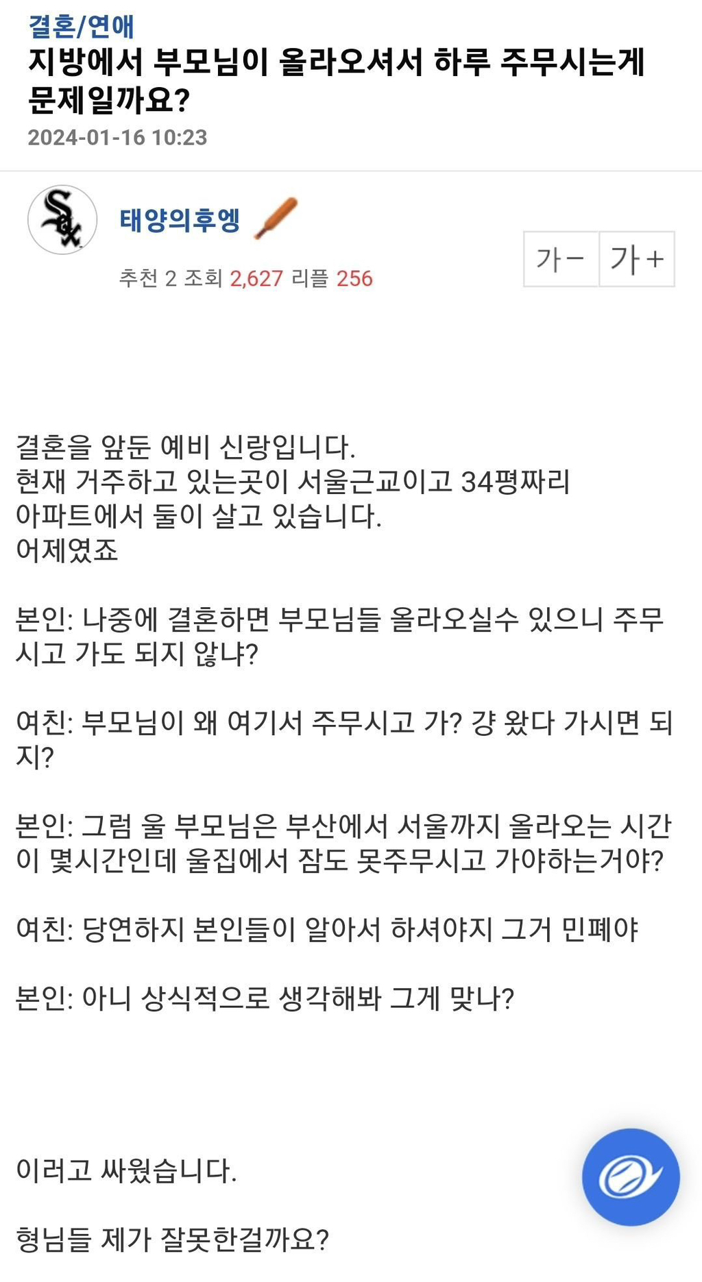 [스크랩] [흥미돋]지방에서 부모님이 오시는데 하루 주무시는게 문제일까요?.jpg 작성자모낙카|작성시간26.02.17|조회수79,873 목록 댓글 222 글자크기 작게가 글자크기 크게가 출처: 여성시대 껌미 다음검색 스크랩 원문 : *여성시대* 차분한 20대들의 알흠다운 공간 현재 게시글 추가 기능 열기 북마크 공유하기 신고 센터로 신고 댓글 댓글 222 댓글쓰기 답글쓰기 댓글 리스트 작성자루비비키 | 작성시간 26.02.19 매정하다.. 작성자나가시는문은저쪽입니다 | 작성시간 26.02.24 파혼하쇼 작성자왜자꾸나를불러 | 작성시간 26.02.26 너무 정없다.. 작성자하버드부속고등학교 | 작성시간 26.03.01 죠다 죠 작성자편히살테얌 | 작성시간 26.03.01 호텔 예약해즈ㅓ 댓글 전체보기
