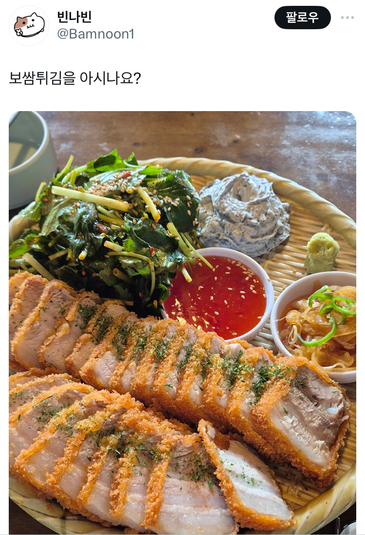 [스크랩] [흥미돋]보쌈튀김을 아시나요? 작성자Salt and Light|작성시간26.02.17|조회수36,932 목록 댓글 22 글자크기 작게가 글자크기 크게가 출처: https://x.com/bamnoon1/status/2006615670562369997?s=46난 이 사진 보고처음 알음 다음검색 스크랩 원문 : *여성시대* 차분한 20대들의 알흠다운 공간 현재 게시글 추가 기능 열기 북마크 공유하기 신고 센터로 신고 댓글 댓글 22 댓글쓰기 답글쓰기 댓글 리스트 작성자갱갱쥐야 | 작성시간 26.02.17 수원에도있어 죤나마싯ㅁ.. 작성자감자형우 | 작성시간 26.02.17 수육튀김 김치맛잇는집가야함 작성자ㅕㅐㅐㅓㅜ | 작성시간 26.02.17 닌 디졋다 작성자에반 벅 버클리 | 작성시간 26.02.18 첨 봐... 작성자장래희망부지런한사람 | 작성시간 26.02.18 수원에이ㅛ어 맛이ㅛ어 댓글 전체보기