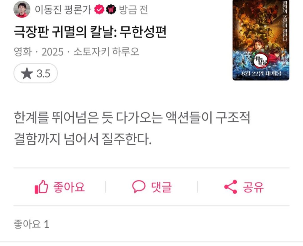 이 전에 평했었던 무한열차와 평점 같음