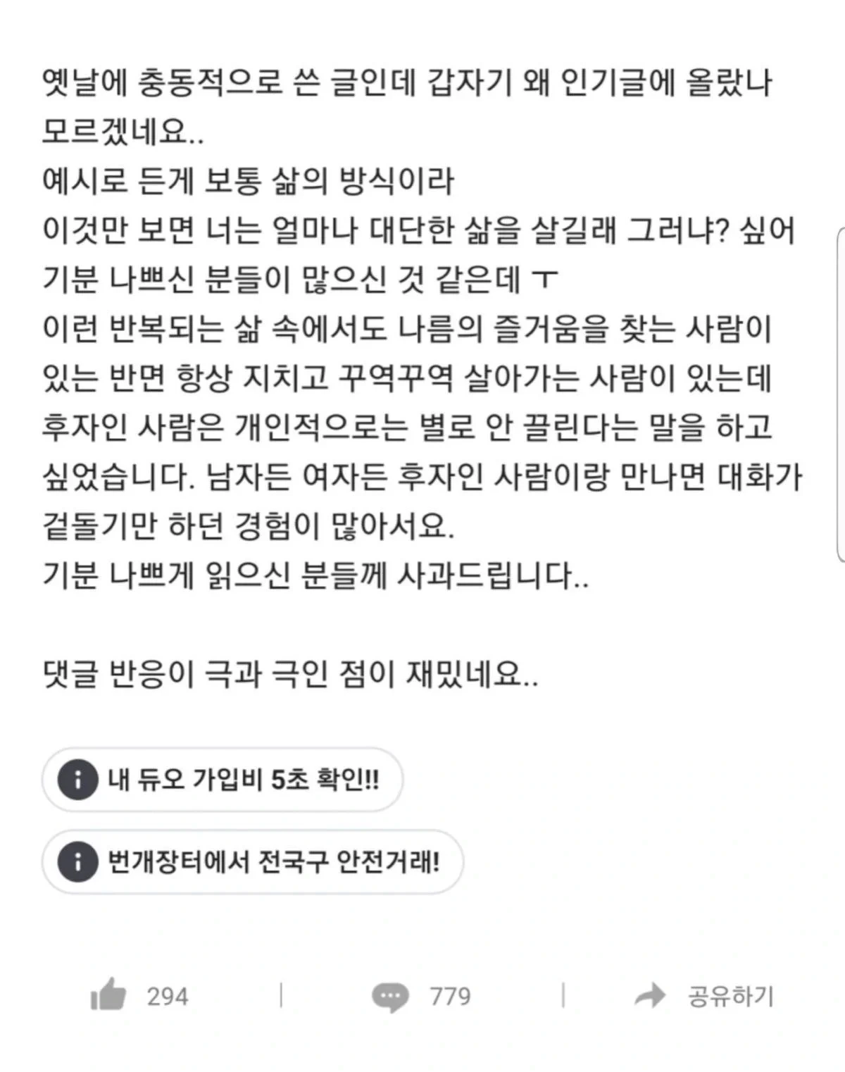 작성자아구찜내사랑 작성시간 26.02.19 난 취향 취미 너무 뚜렷한 사람 싫음. 맞춰갈 생각 안하고 지 하고싶은거 지 보고싶은거만 함. 그리고 개방적이지 않음 유들유들한 사람이 좋아~