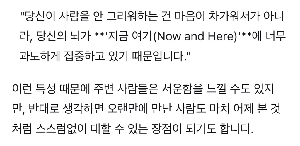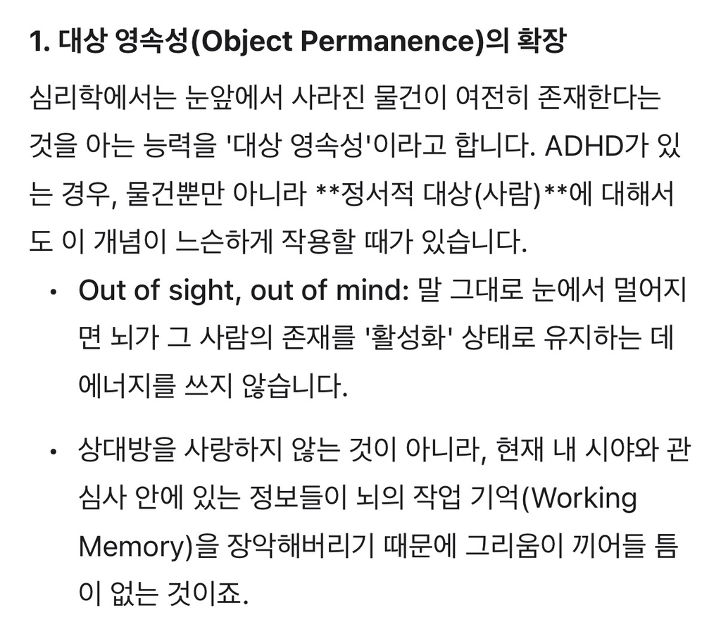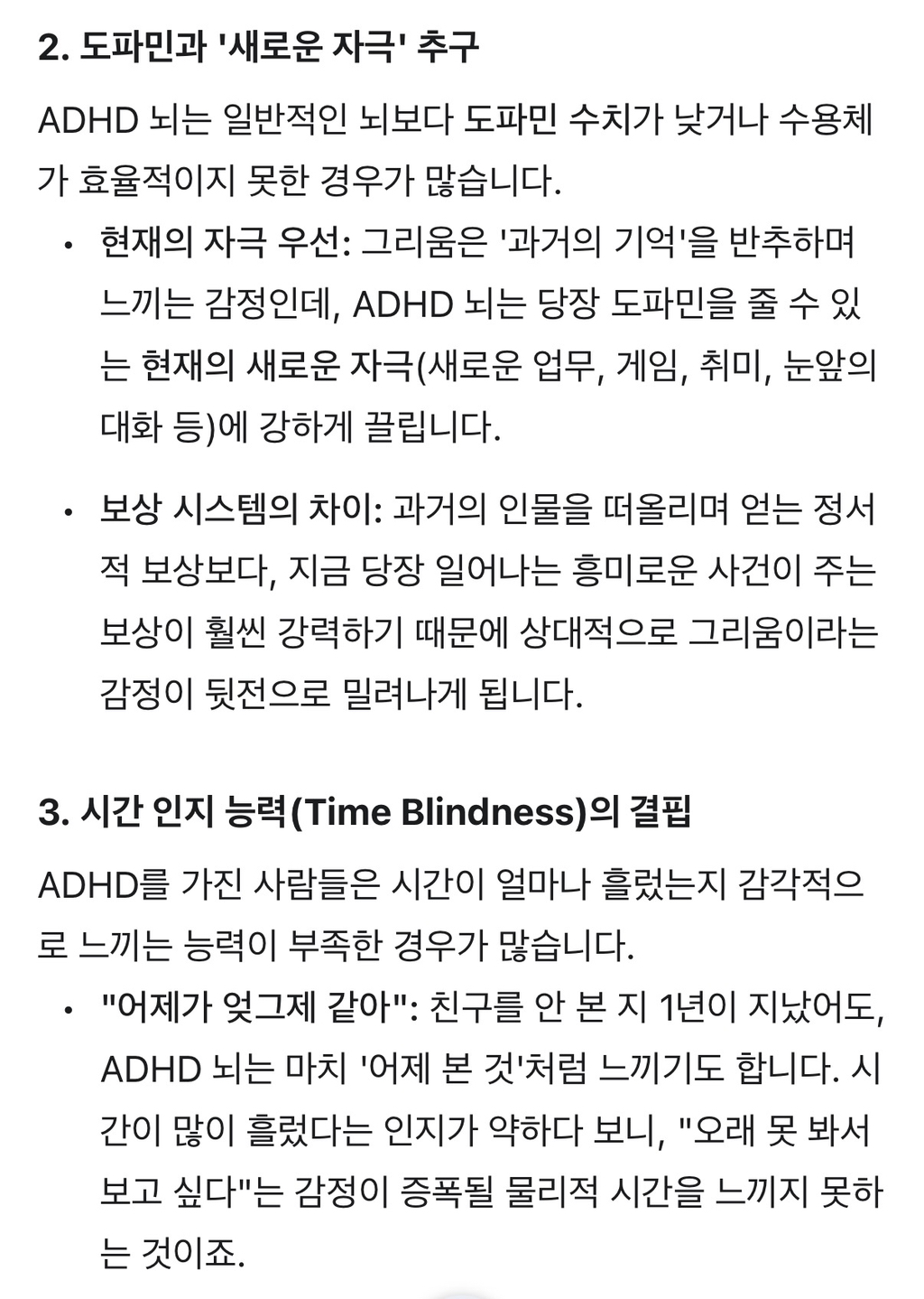 나 adhd인데 진짜 소중한 사람은 눈에 안 보이면 없어질 것 같고 누군가를 그리워한다는 감정이 뭔지 잘 모르겠음 ㅋㅋㅋㅋㅋ 신기하다