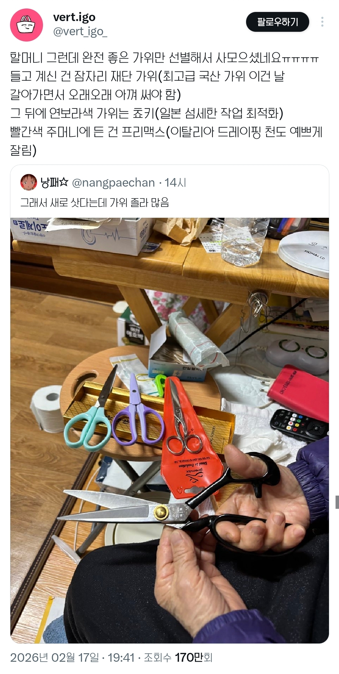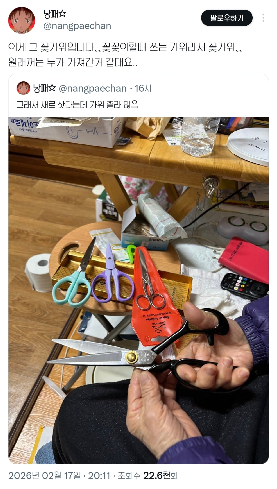 [흥미돋]할머니 가위 잃어버렷다길래 그렇구나.햇은데 이정도로 슬퍼하고 잇엇음.twt 작성자카이지|작성시간26.02.18|조회수77,297 목록 댓글 61 글자크기 작게가 글자크기 크게가 출처: https://x.com/i/status/2023675386849042935https://x.com/i/status/2023675386849042935https://x.com/i/status/2023675911950799230https://x.com/i/status/2023709314859626869https://x.com/i/status/2023749915114148111https://x.com/i/status/2023769138800587124++ 추가) 다행히(?) 깅어 가위 아니고 그냥 꽃꽃이 가위라네요https://x.com/i/status/2023716918742732858 다음검색 현재 게시글 추가 기능 열기 북마크 공유하기 신고 센터로 신고 댓글 댓글 61 댓글쓰기 답글쓰기 댓글 리스트 작성자잡내가득~ | 작성시간 26.02.18 가위의 세계 넓다 작성자투쓰리포 | 작성시간 26.02.18 귀여우셬ㅋㅋㅋㅋㅋㅋㅋㅋㅋ 작성자미분양내향인 | 작성시간 26.02.18 나 눈물나 작성자두바이쫀딕쿠키 | 작성시간 26.02.18 새거랑 내 추억이 있는거랑은 다른데ㅠ 가위도둑놈 너무하네 작성자따봉고슴도치의 습격 | 작성시간 26.02.18 어떤새끼가 가져갔냐 진짜 댓글 전체보기