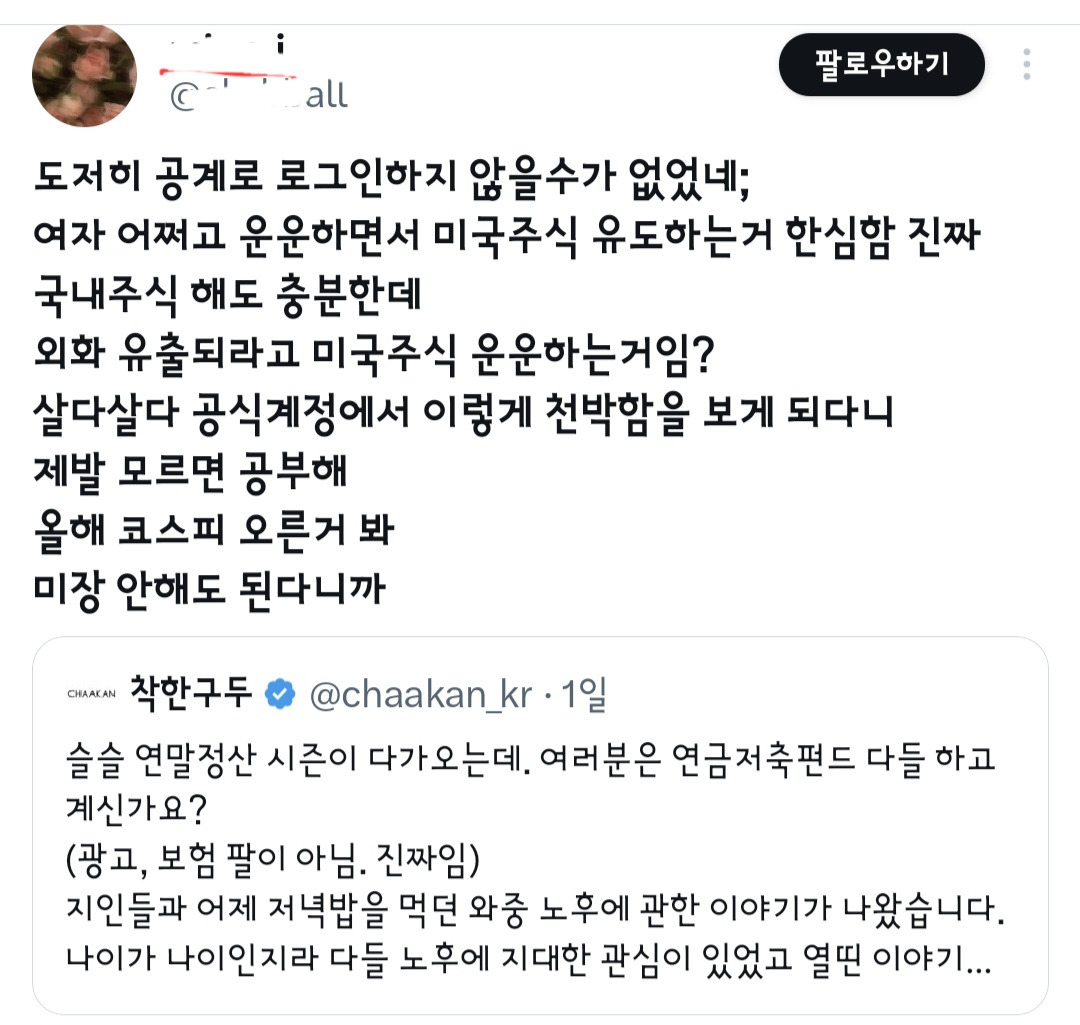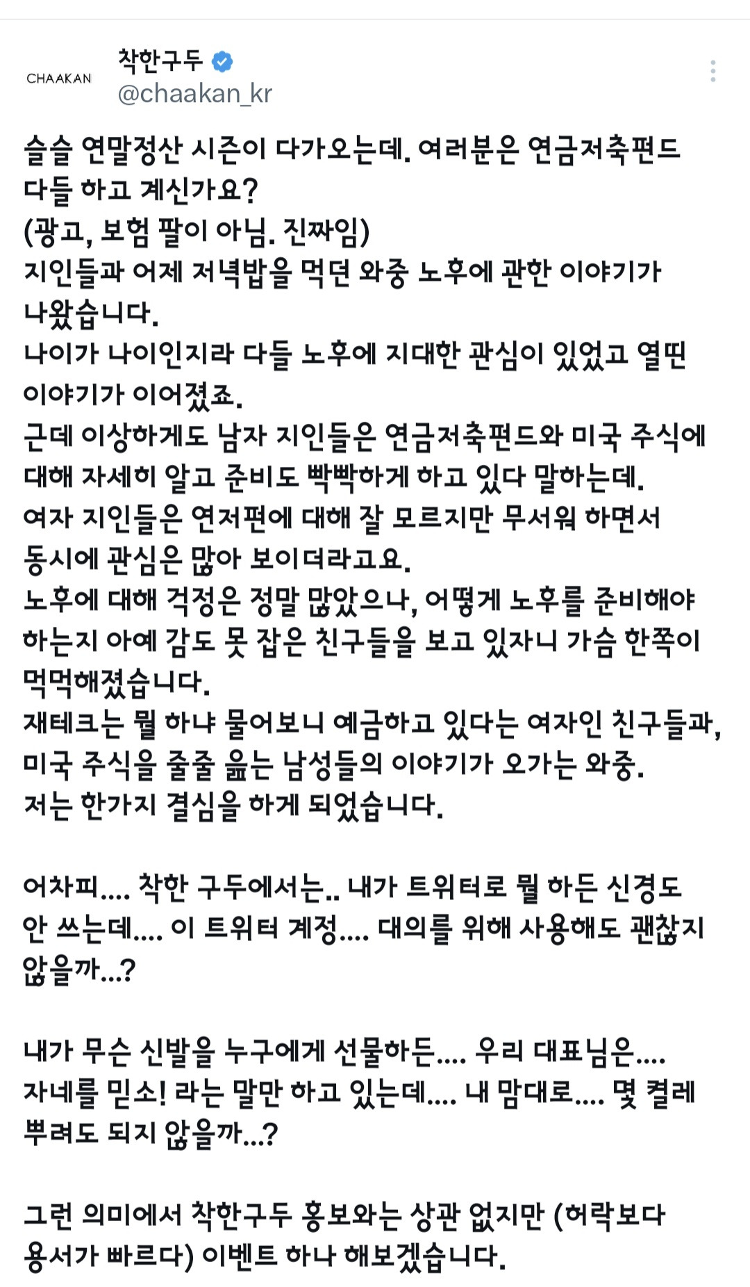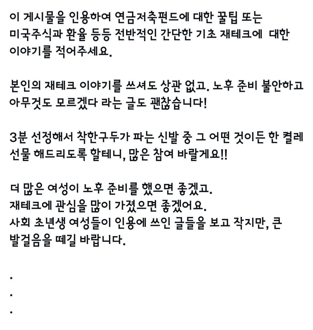 트위터 눈팅하다가 갑자기 개뜬금없는 글을 봤음ㅋㅋ 아니 신발파는 회사에서 연금저축펀드를 홍보하는거임ㅋㅋㅋㅋㅋ 뭔가 싶어서 쭉 읽어봤는데 너무 좋은 내용 많아서 여시에도 올려봄