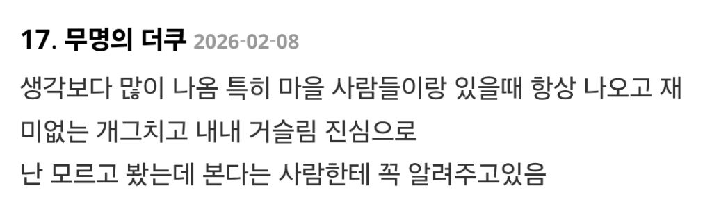 작성자검색을하든가지나가든가 작성시간 26.02.19 여캐는 쓸만한 여캐포함 유의미한 비중이나 대사도 서사도 안내놓고 오달수나오는거 좀 괘씸함