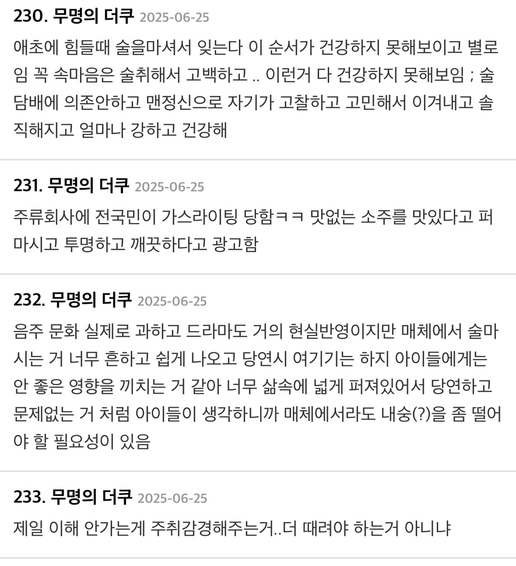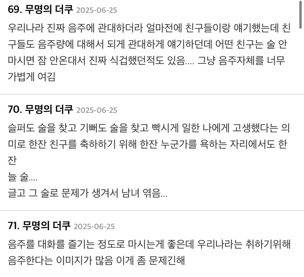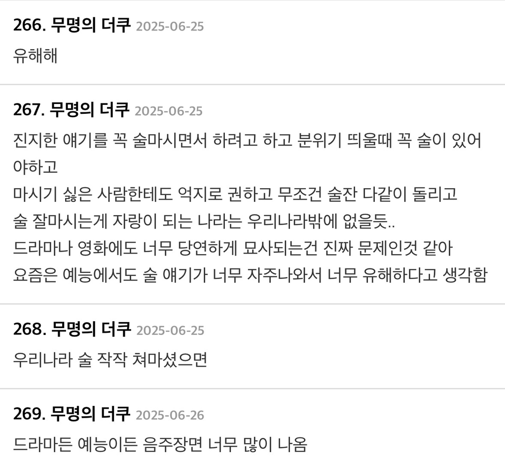 작성자마라탕수육개장 작성시간 26.02.18 난 우리나라뿐만 아니라 전 세계 모두 문제라고 생각함.. 술을 진짜 너무 많이 마셔 ㅡㅡ