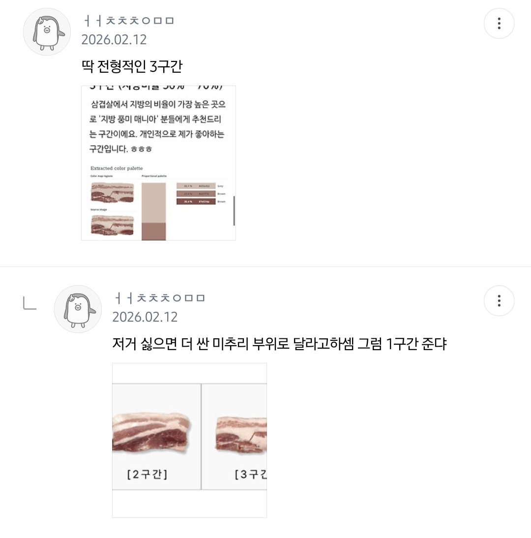 [흥미돋]지방이 많다고 반품된 삼겹살 작성자계절 틈에 잠시 피는 낯선꽃처럼|작성시간26.02.18|조회수16,609 목록 댓글 68 글자크기 작게가 글자크기 크게가 출처: https://m.cafe.daum.net/subdued20club/ReHf/5574224?svc=cafeapp지방이 많기는 해도 반품까지 할 일은 아닌 것 같은데..여시정보 캡쳐 다음검색 현재 게시글 추가 기능 열기 북마크 공유하기 신고 센터로 신고 댓글 댓글 68 댓글쓰기 답글쓰기 댓글 리스트 작성자에에에에에엣취 | 작성시간 26.02.18 111 작성자다이소엠벗어더 | 작성시간 26.02.18 지방이 맛있잔아 작성자슈퍼리치 | 작성시간 26.02.18 2구간이 존맛 작성자wolala | 작성시간 26.02.18 아무리 1구간이라도 식감이 목살이랑은 다른데..ㅋㅋㅋ 나도 지방 많은거 싫어서 저렇게 나오면 다시는 안 갈거 같긴 함. 지방이 좋으면 삼겹살 안 먹고 대창을 먹겠쥬.. 작성자엥?에엥? | 작성시간 26.02.18 사진 맛있어 뵈는디 댓글 전체보기