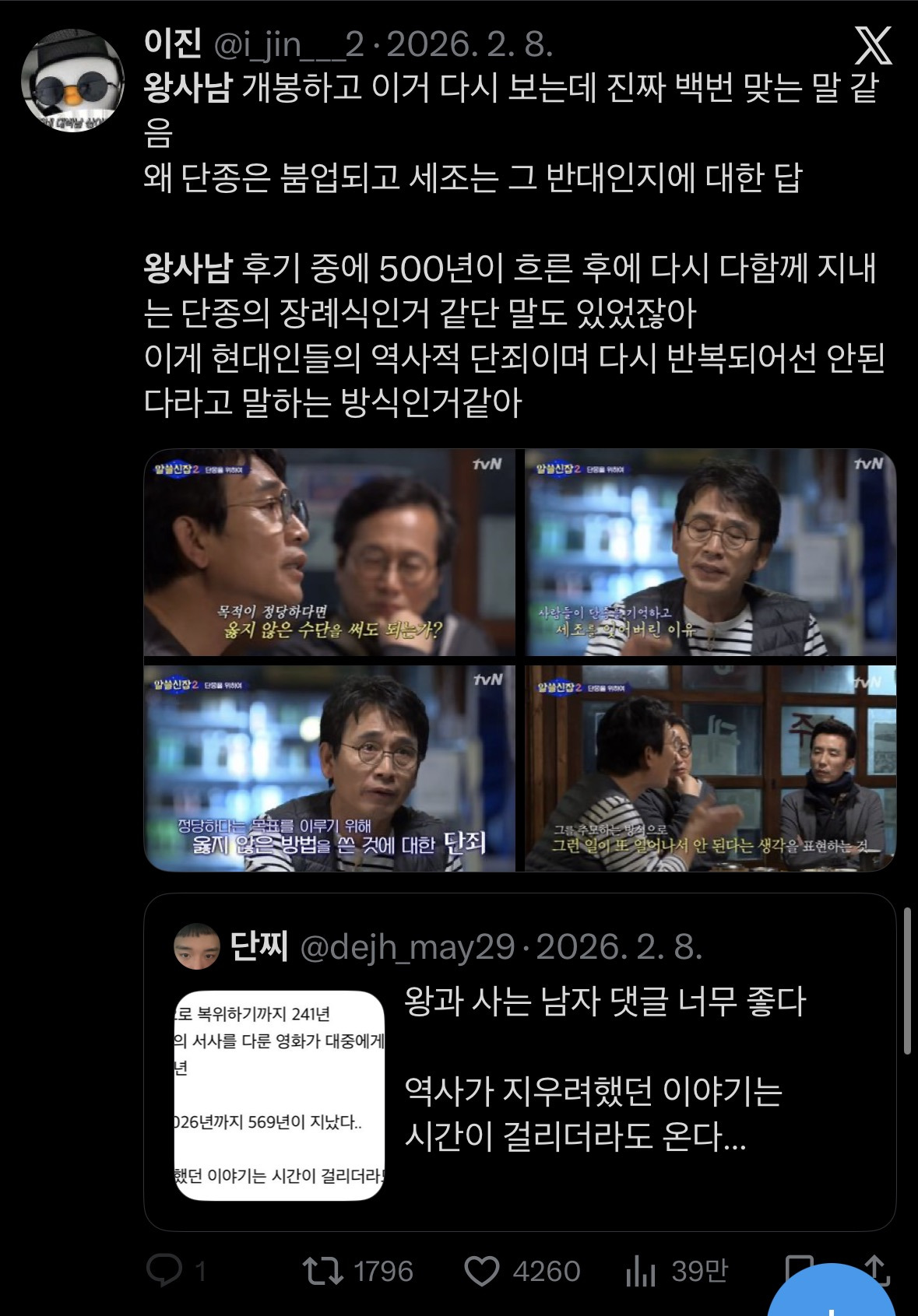 작성자로즈토네르 작성시간 26.02.18 그 당시에는 자세한 정치 사정같은거 모르는 양민들이 90퍼센트 였을텐데 당시 백성들이 단종의 이야기를 잊지 않은걸 보면 많은걸 생각하게됨