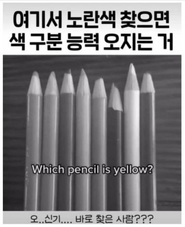 [스크랩] [흥미돋]여기서 노란색 찾으면 색 구분 능력 오지는 거 작성자여단오여|작성시간26.02.18|조회수36,660 목록 댓글 74 글자크기 작게가 글자크기 크게가 출처: https://theqoo.net/square/4034779379더쿠 - 여기서 노란색 찾으면 색 구분 능력 오지는 거여기를 눌러 링크를 확인하세요theqoo.net 다음검색 스크랩 원문 : *여성시대* 차분한 20대들의 알흠다운 공간 현재 게시글 추가 기능 열기 북마크 공유하기 신고 센터로 신고 댓글 댓글 74 댓글쓰기 답글쓰기 댓글 리스트 작성자될일될 | 작성시간 26.02.18 성공 작성자수확의정석 | 작성시간 26.02.18 흰색이룠네 ㅋㅋㅋㅋㅋ 작성자토순토토_모모코코요니 | 작성시간 26.02.18 바로 맞춤 뭐여 신기햐 작성자쏴리쏴리 | 작성시간 26.02.18 찾았다 ㅎ 작성자호뇨뇨뇨몽 | 작성시간 26.02.18 헉 찾았어 뭐야 댓글 전체보기
