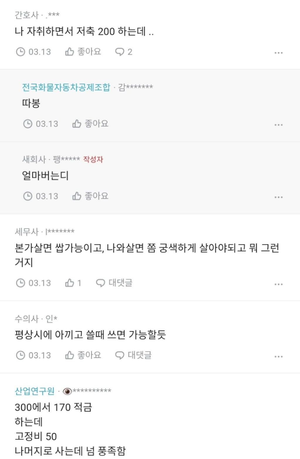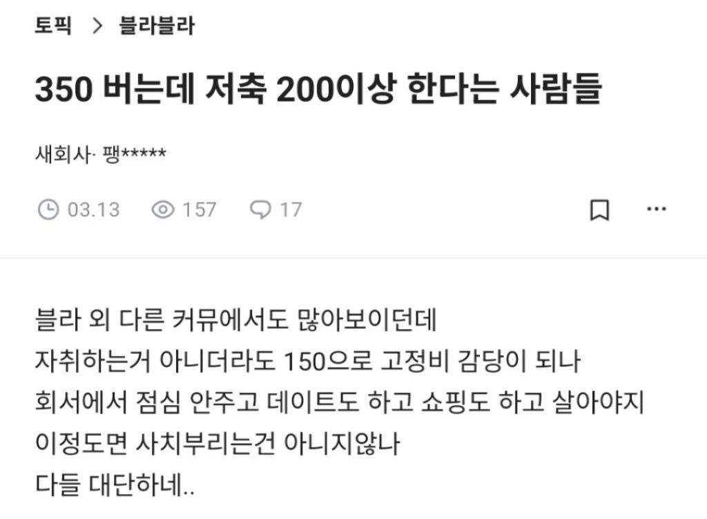 작성자day 6 작성시간 26.02.19 220에서 대출금 20 공과금 10 교통비 13 통신비 2 적금 70 저금 20~30 정도 ..