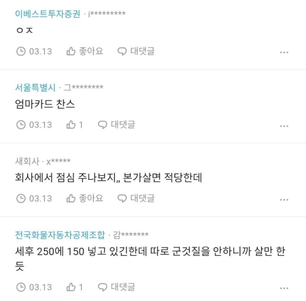 작성자가모라 작성시간 26.02.19 350이몀 나도 200가능이다... 부럽다 150으로 해외여행도 연 2회이상갈듯 물론 캥 기준임