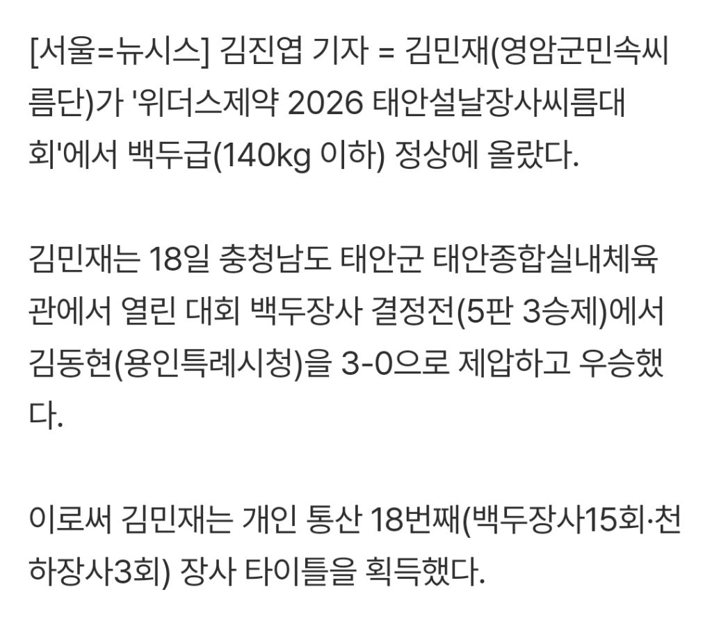 [여시뉴스데스크]김민재, 설날장사씨름대회 백두급 제패…통산 18번째 장사 작성자띠링!|작성시간26.02.18|조회수19,662 목록 댓글 18 글자크기 작게가 글자크기 크게가 출처: https://naver.me/GB3bjXFH김민재, 설날장사씨름대회 백두급 제패…통산 18번째 장사여기를 눌러 링크를 확인하세요m.sports.naver.com김민재 장사 축하합니다🎉씨름 잘해서 좋겠다 다음검색 현재 게시글 추가 기능 열기 북마크 공유하기 신고 센터로 신고 댓글 댓글 18 댓글쓰기 답글쓰기 댓글 리스트 작성자김흥수 | 작성시간 26.02.18 이야 작성자산독기독기야어디를가느냐~ | 작성시간 26.02.18 민재 스트롱스트롱 작성자머리 아파 | 작성시간 26.02.18 자이언트 베이비 작성자과일몬스터 | 작성시간 26.02.18 축하해 자이언트베이비!!! 작성자낑카 | 작성시간 26.02.18 민재야 가자~! 댓글 전체보기