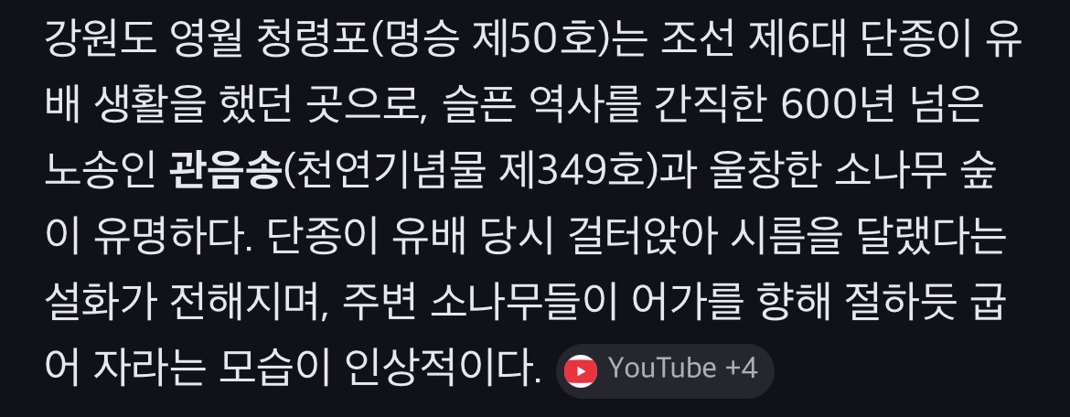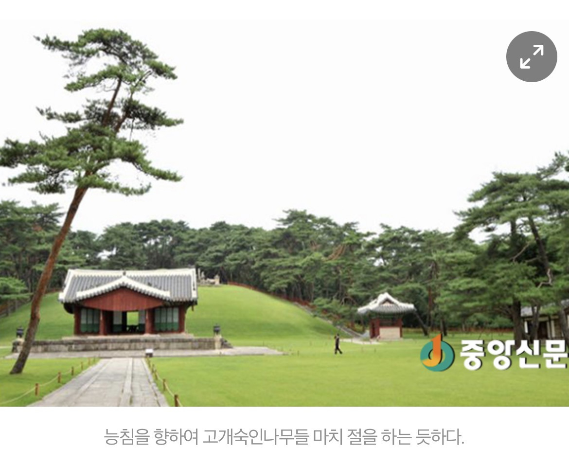 소나무가 충절(충성과 절의)의 상징인데 저렇게 소나무들이 단 한곳을 향해 일제히 고개를 조아리는 듯한 형상이 절대 흔하지 않는 특이현상이라고함 모든 왕의 릉에 저렇진 않고 세종대왕릉과 단종 유배지에 자연적으로 저렇게 되어있다고ㅇㅇ