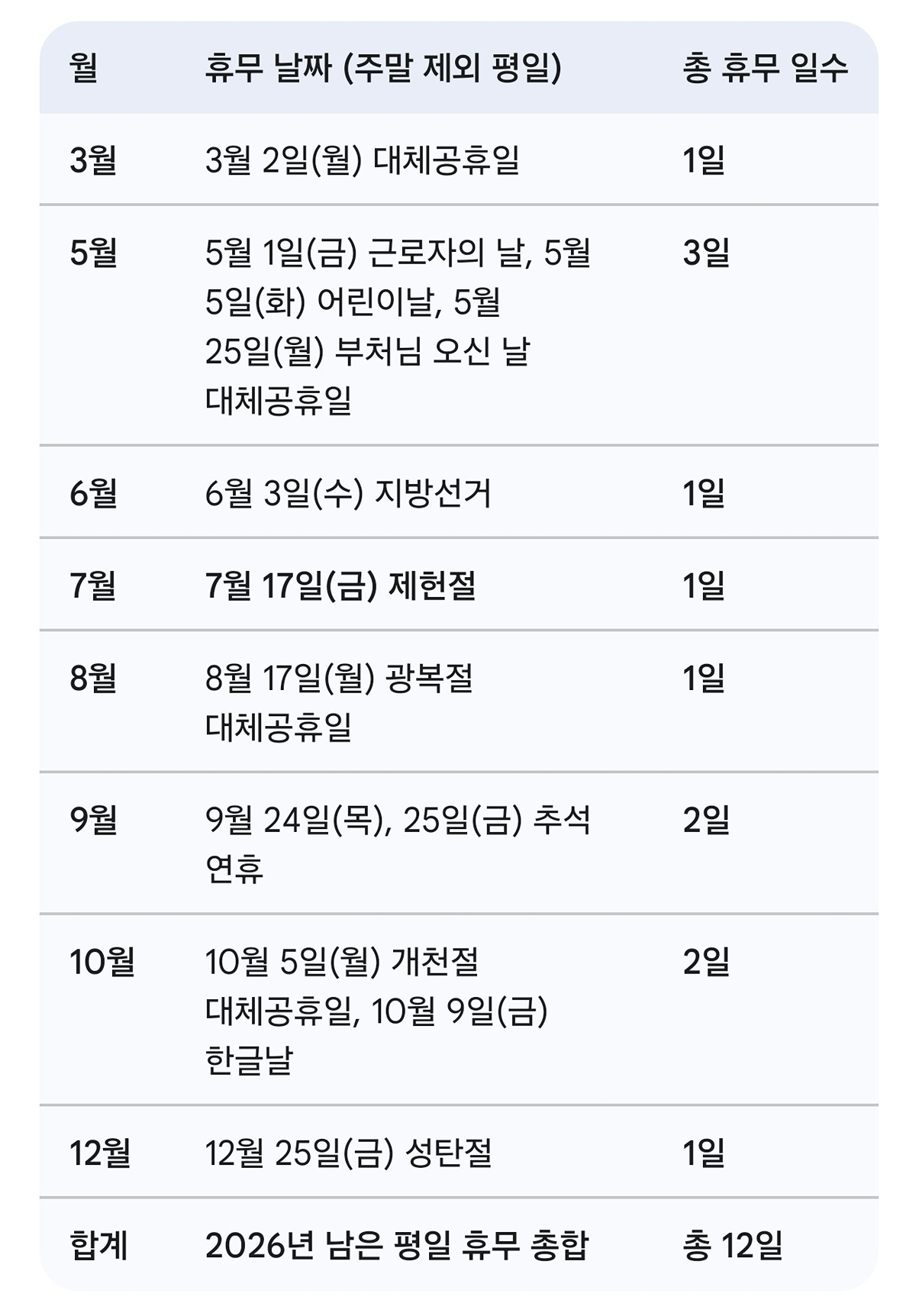 근로자의 날 포함 평일 휴일 총 12일...