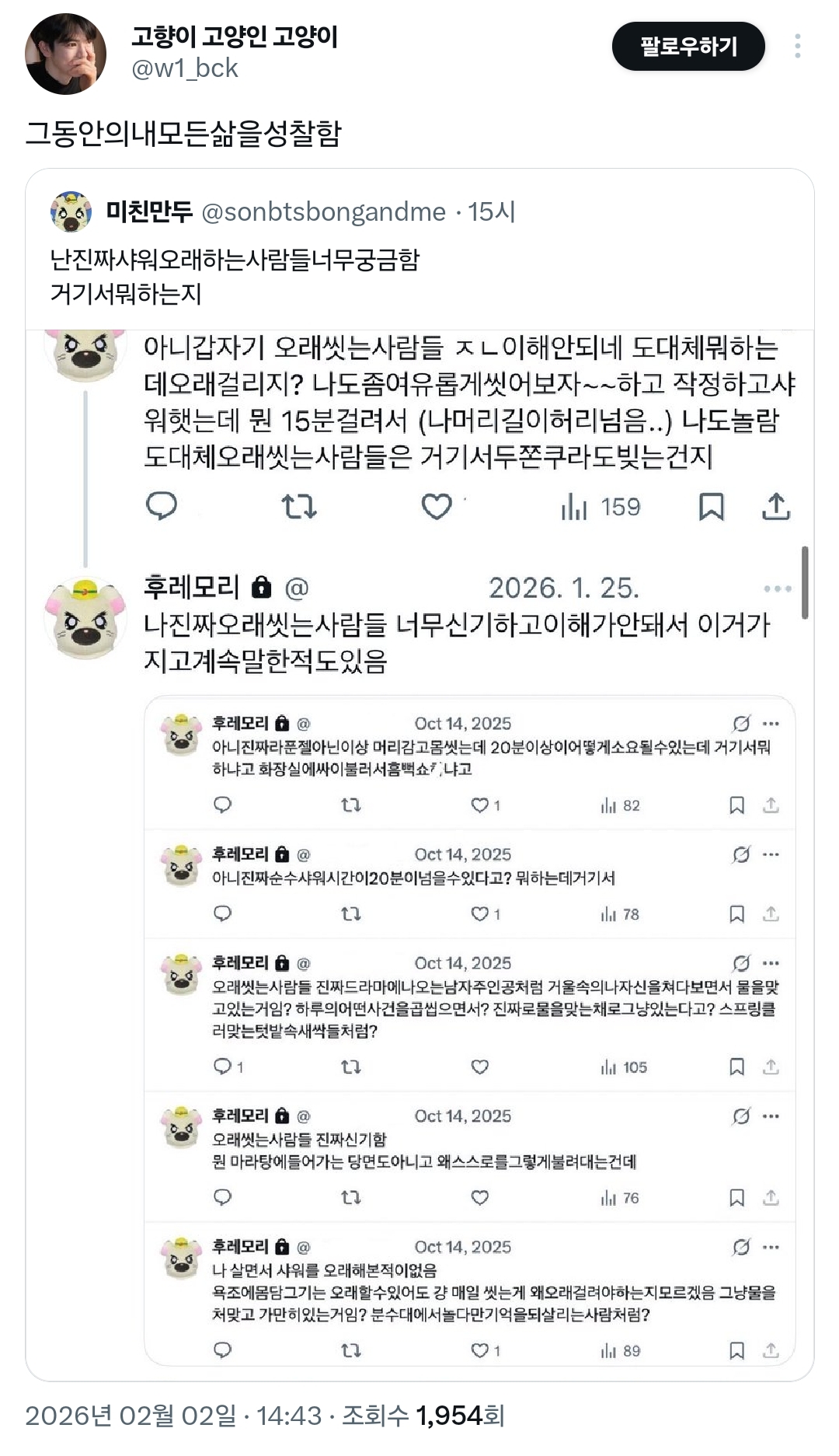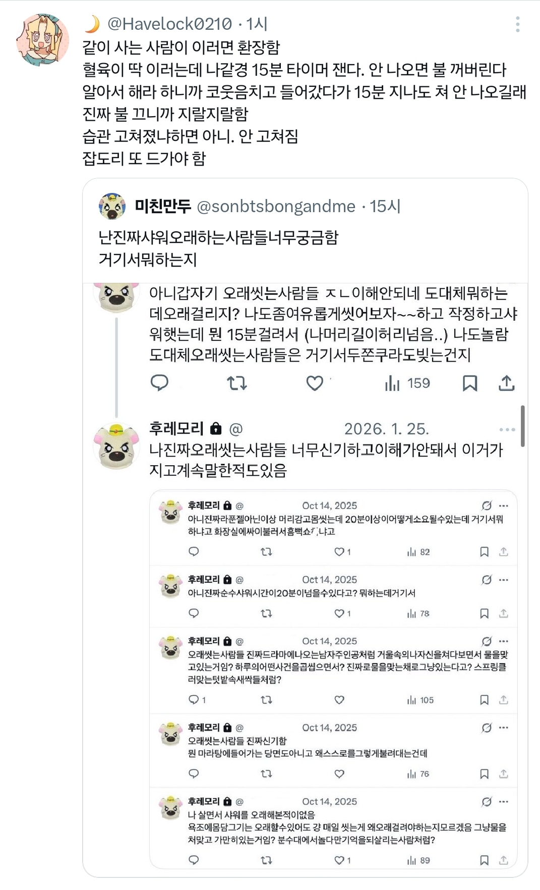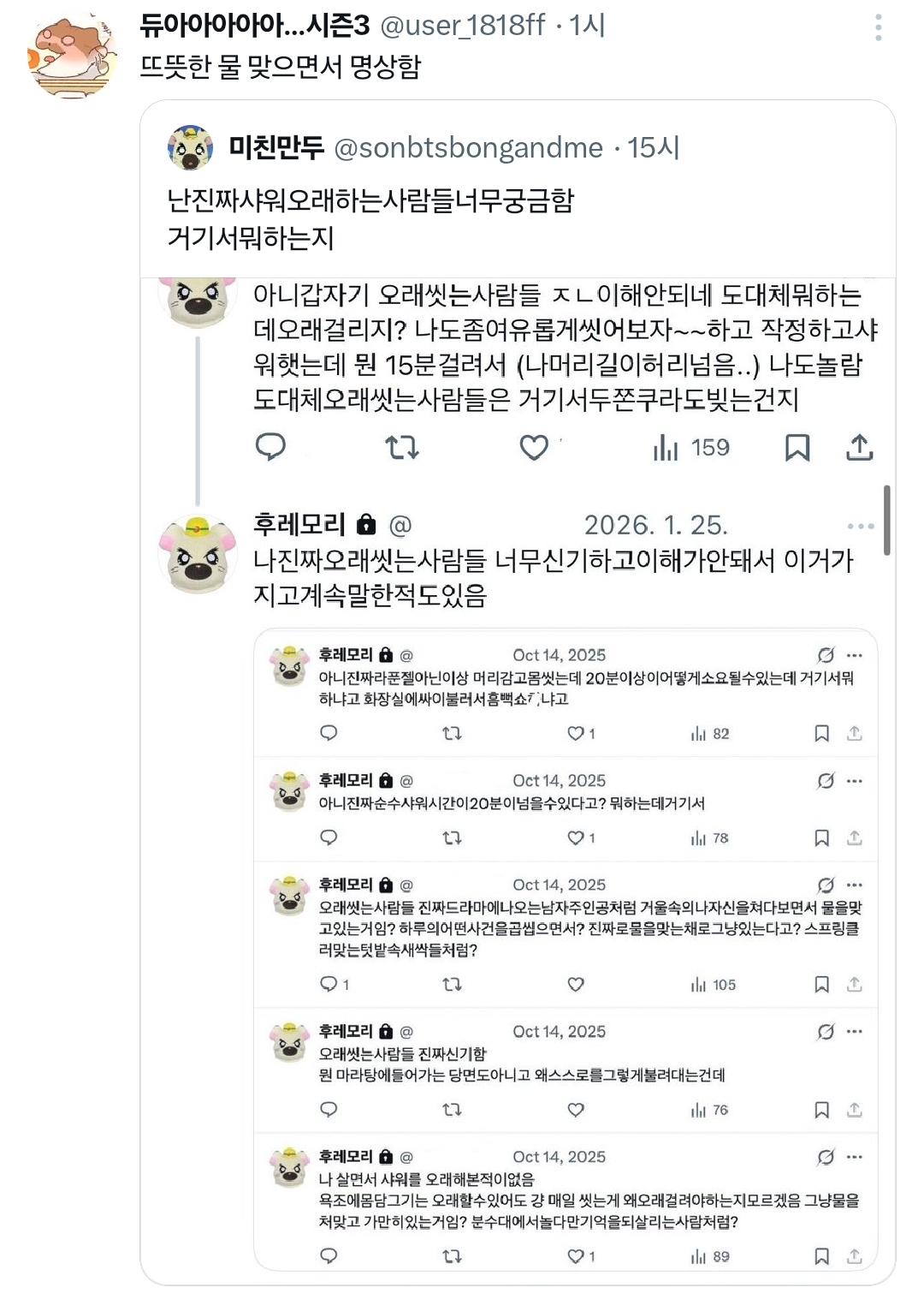 작성자야~호~ 작성시간 26.02.20 빨리 씻어도 20분이던데.. 머리감는데 3-5분 머리에 트리트먼트 발라놓기 2분 양치하기 5-8분 트리트먼트 헹구기 3분 세수하기 3분 몸닦기 3-5분 앞에 다 헹구긴 했지만 모든걸 전체적으로 다시한번 헹구기 하면 30분 기본아니냐고.. 난 빨리씻는게 더 이해가안가