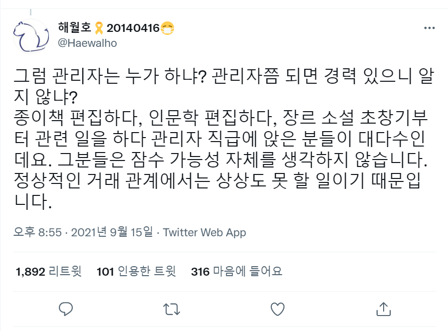 로 사고가 튀는거야 ㅋㅋ 그들에게 출판사나 웹소설 작가는 애초에 고려 대상도 아님 그러니까 수많은 잠수에도 사과 하나 없지