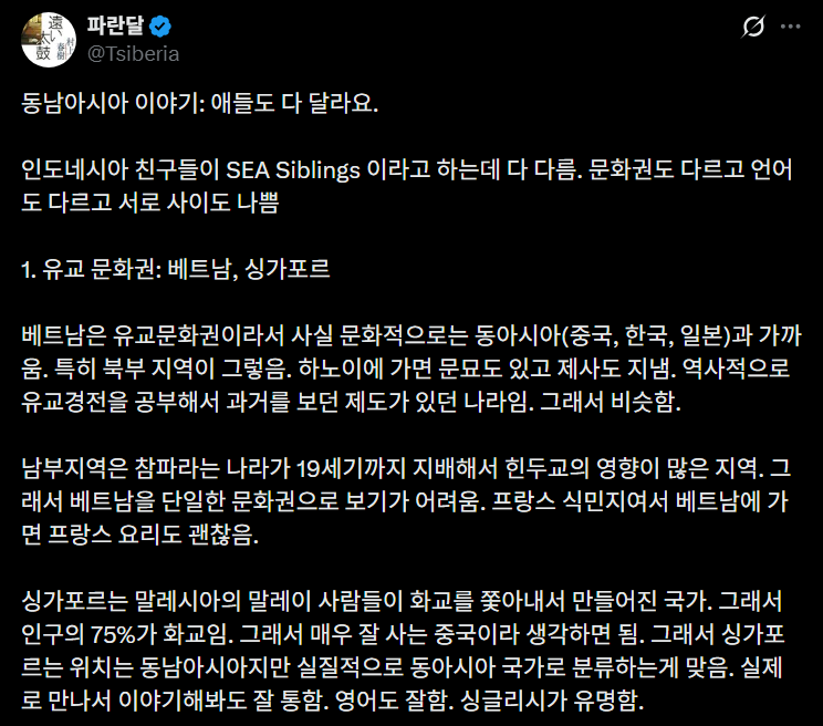 작성자카레 노래 작성시간 26.02.19 싱가폴 다문화 국가라 동남아시아로 분류하는게 맞음