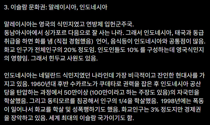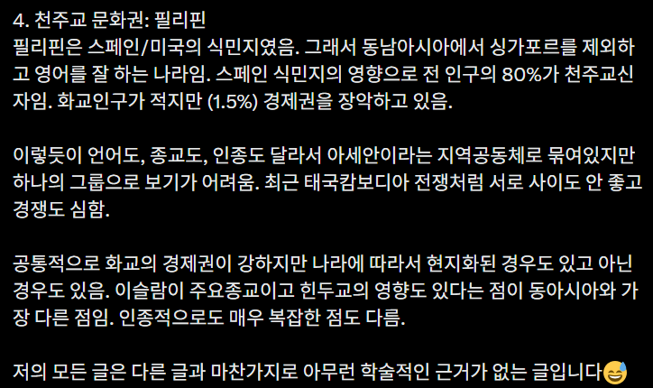 문화권은 문화권일 뿐 싱가포르와 태국에도 무슬림이 다수 있고, 인도네시아에도 기독교 신자들이 있고, 필리핀에도 무슬림이 있고(여긴 이슬람 무장 세력도 있음..) 그럼