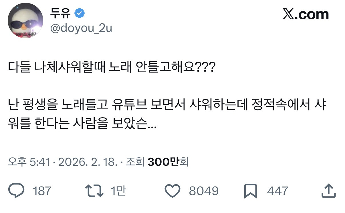 작성자읽고쓰는삶 작성시간 26.02.20 아니 난 노래들으면서 샤워하는게 귀찬ㄹ을거같은데ㅋㅋㅋㅋ