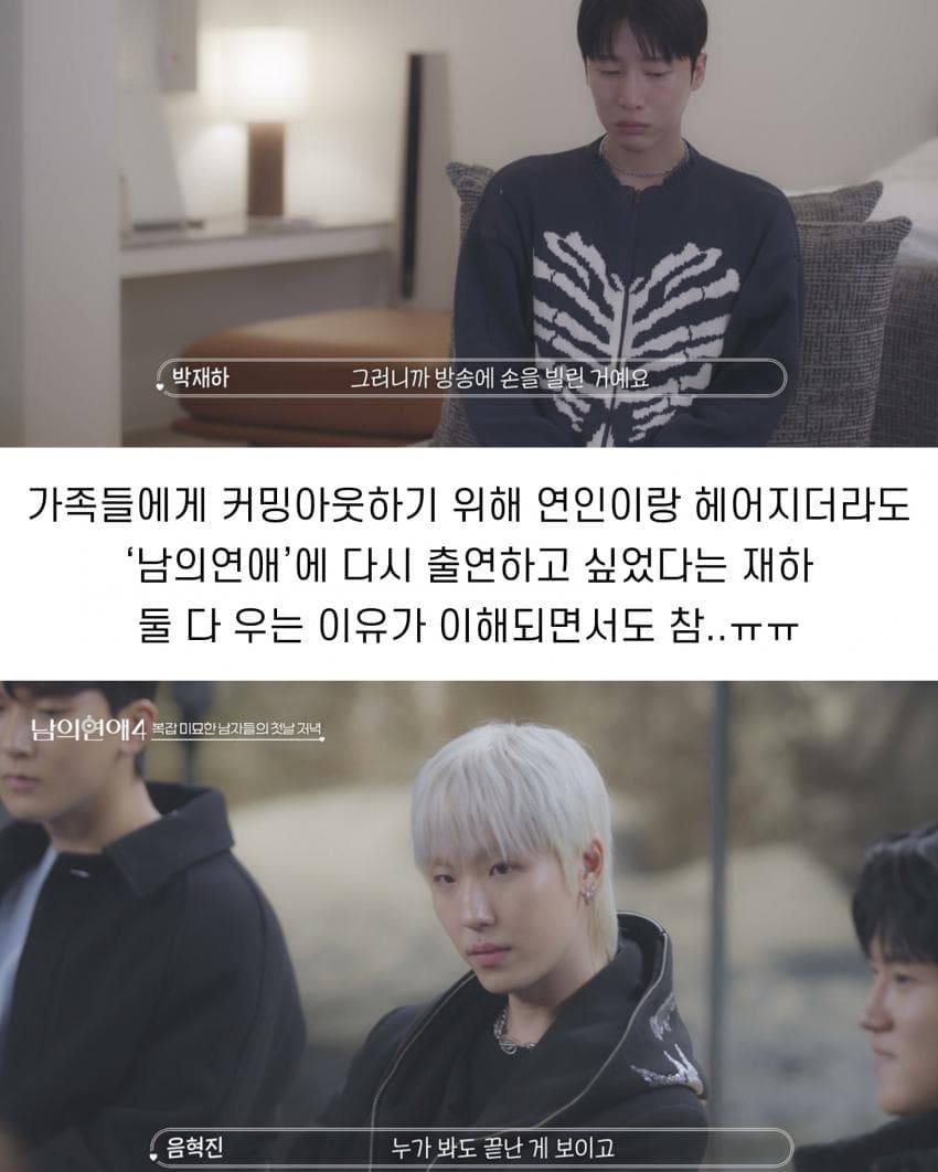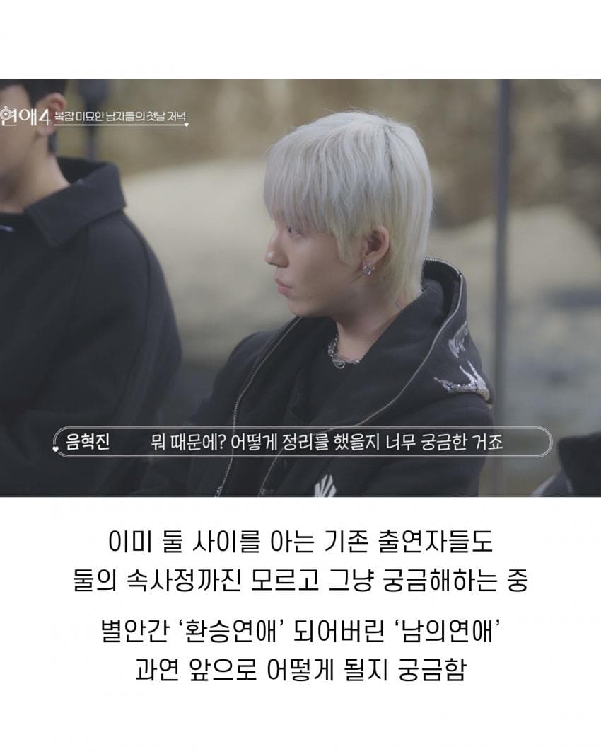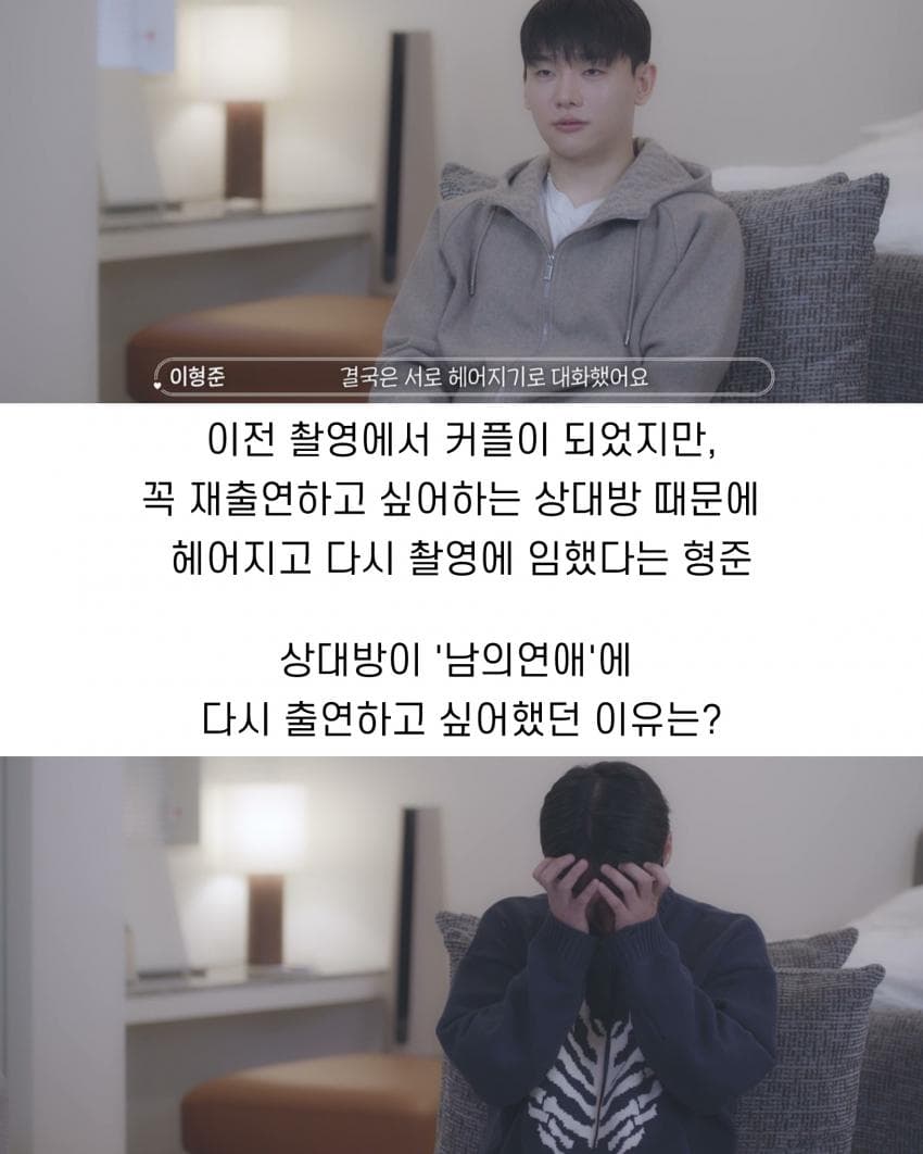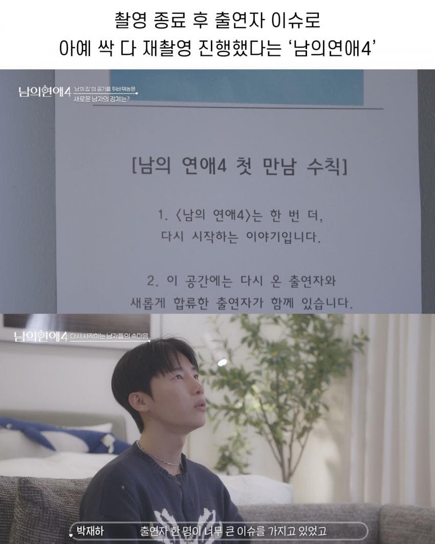 작성자쥑스터 작성시간 26.02.19 촬영함, 커플 됨->이슈 발생, 재촬영하기로 함-> 재촬영하기 위해서 첫촬영때 커플된 사람들이 헤어짐(커플상태로는 출연안되니까)