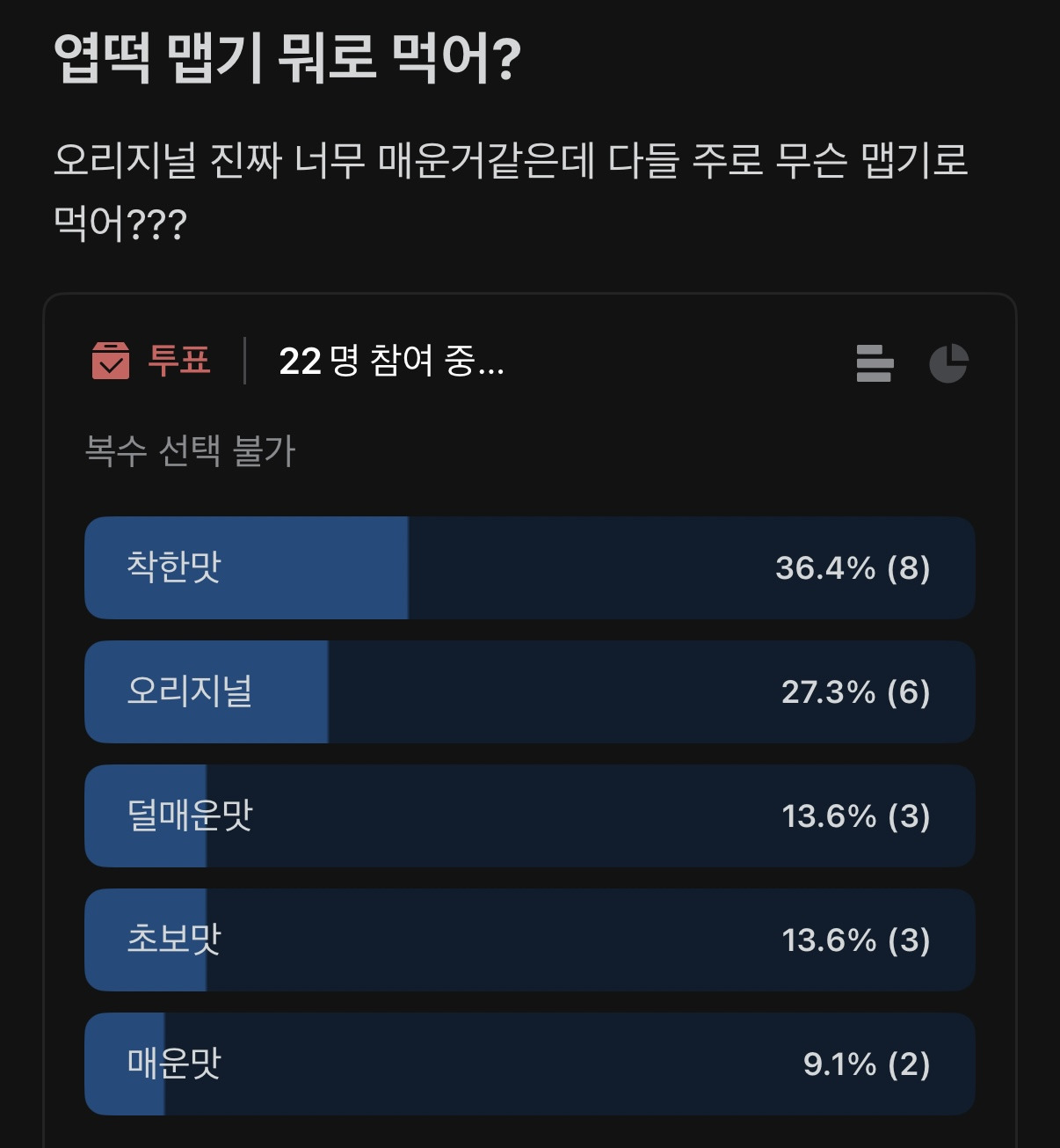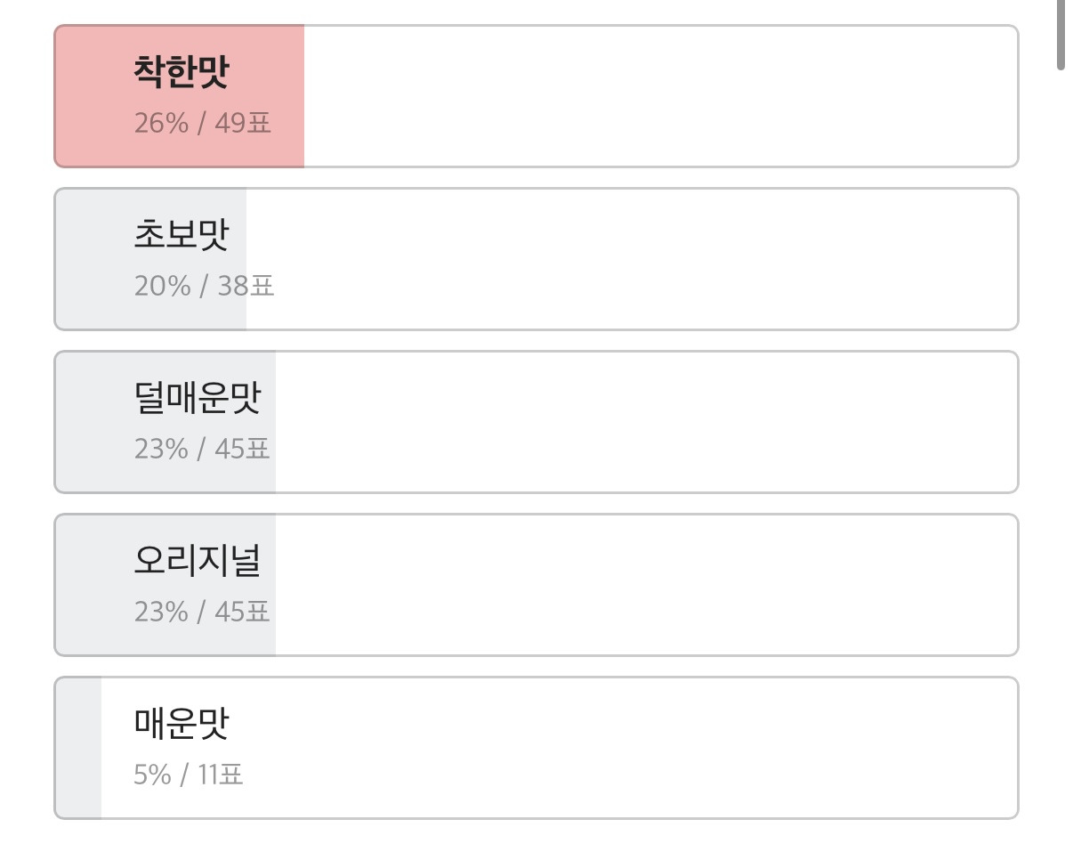 [스크랩] [흥미돋]의외로 수요 많다는 엽떡 착한맛.jpg 작성자Salt and Light|작성시간26.02.19|조회수6,865 목록 댓글 19 글자크기 작게가 글자크기 크게가 출처: 여성시대 남남수수학학원원생아니 엽떡은 매운맛으로 먹는거 아니었냐며...ㄴㅇㄱ난 늘 오리지널만 먹으면서 살아왔는데...엽떡 맵기로 여기저기 찾아보다가 투표결과 너무 의외라서 낋여옴 다음검색 스크랩 원문 : *여성시대* 차분한 20대들의 알흠다운 공간 현재 게시글 추가 기능 열기 북마크 공유하기 신고 센터로 신고 댓글 댓글 19 댓글쓰기 답글쓰기 댓글 리스트 작성자김주훈 | 작성시간 26.02.19 저 착한맛만 먹어요 ㅠ 작성자둥지냉면 | 작성시간 26.02.19 맵찔이인 나한텐 착한맛도 안착해ㅋㅋ 작성자내가제일좋아 | 작성시간 26.02.19 맵찔이라 무조건 착한맛 근데 이것도 씁하야 작성자duolingo | 작성시간 26.02.19 강경 덜매운맛 파 ㅋㅋㅋ 작성자호호랑랑 | 작성시간 26.02.19 착한맛도 매워,,, 댓글 전체보기