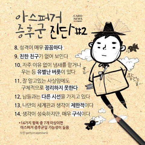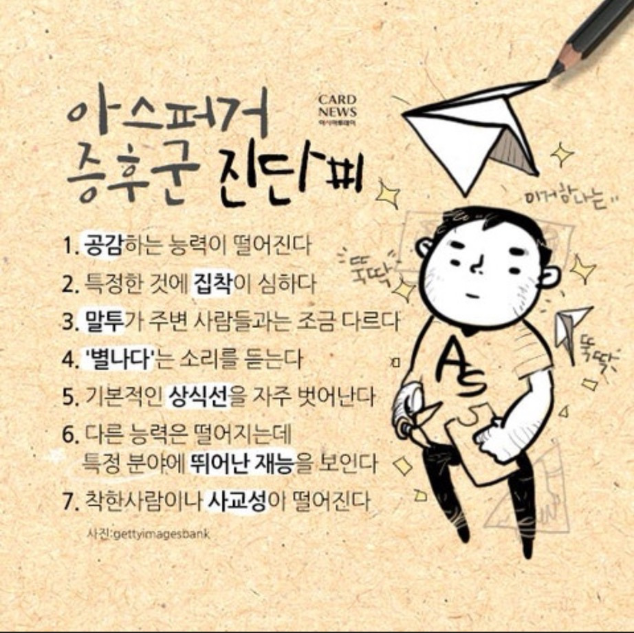 [스크랩] [흥미돋]성인 아스퍼거 증후군 테스트 작성자nuxe|작성시간26.02.19|조회수18,203 목록 댓글 4 글자크기 작게가 글자크기 크게가 14가지 항목 중 7개 이상이면아스퍼거 증후군일 가능성이 높다고 함 다음검색 스크랩 원문 : 비공개카페 현재 게시글 추가 기능 열기 북마크 공유하기 신고 센터로 신고 댓글 댓글 4 댓글쓰기 답글쓰기 댓글 리스트 작성자일본너어어어무싫다 | 작성시간 26.02.19 5개라다행 작성자더우티 | 작성시간 26.02.19 떠오르는 사람 몇 있다 작성자머먹징 | 작성시간 26.02.19 요즘 아따맘마 봐서 그런가 여울이 생각나네 작성자꾸구구구구국 | 작성시간 26.02.20 쉘든..? 댓글 전체보기